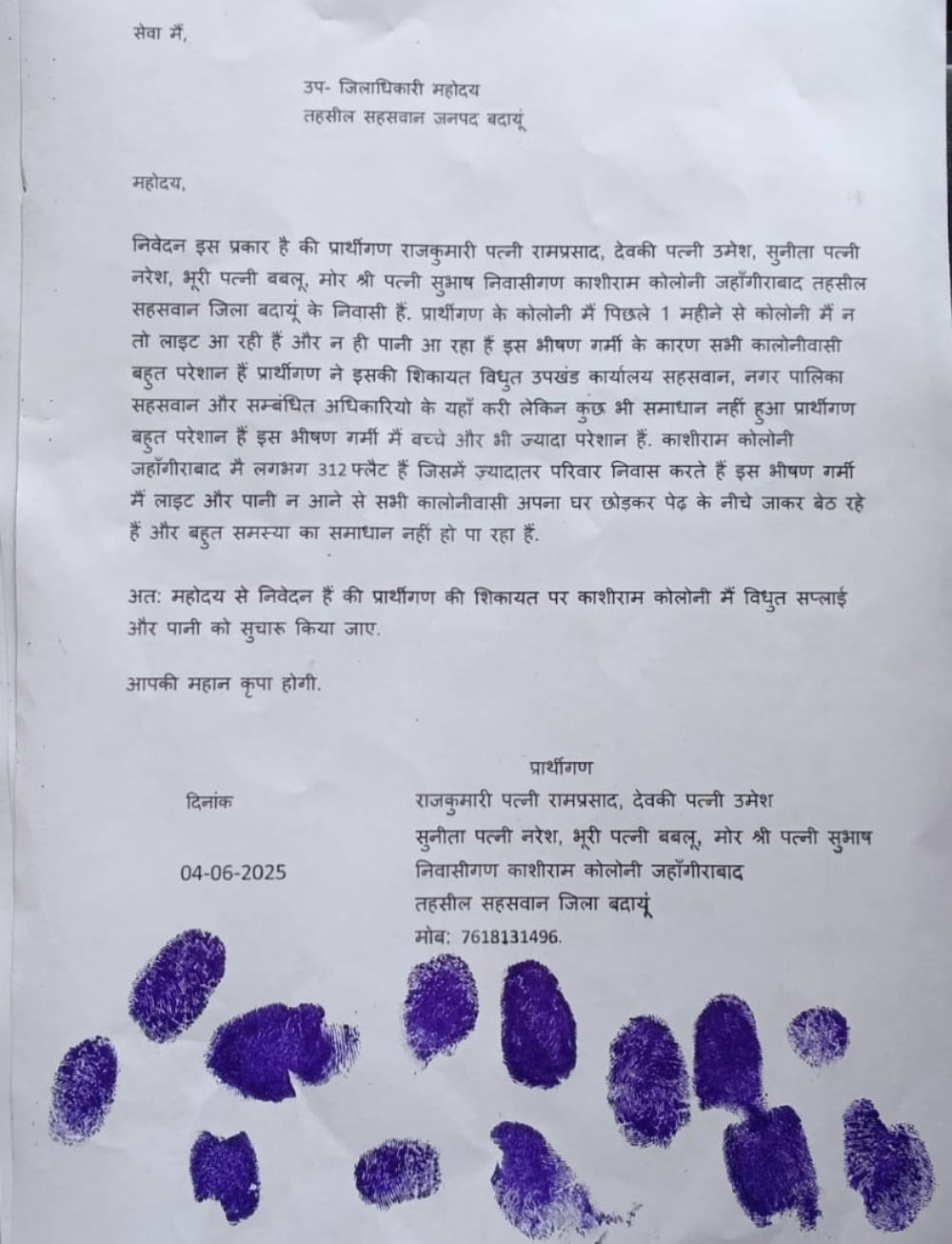 करते हैं इस भीषण गर्मी में लाइट और पानी न आने से सभी कॉलोनी वासी अपना घर छोड़कर पेड़ के नीचे बैठने को मजबूर है शिकायतकर्ताओं का कहना है की शिकायतों के बावजूद आज तक समाधान नहीं हुआ है। उन्होंने अधिकारियों से गुहार लगाई है जल्द से जल्द समस्या का समाधान की मांग की है प्रार्थना पत्र देने वालों में राजकुमारी,देवक, सुनीता,भूरी, मोर श्री,राम प्रसाद,उमेश,नरेश, बबलू,सुभाष समस्त निवासी काशीराम कॉलोनी जहांगीराबाद सहसवान ने प्रार्थना पत्र पर अंगूठे लगाकर उप जिलाधिकारी सहसवान को प्रार्थना पत्र दिया है।
