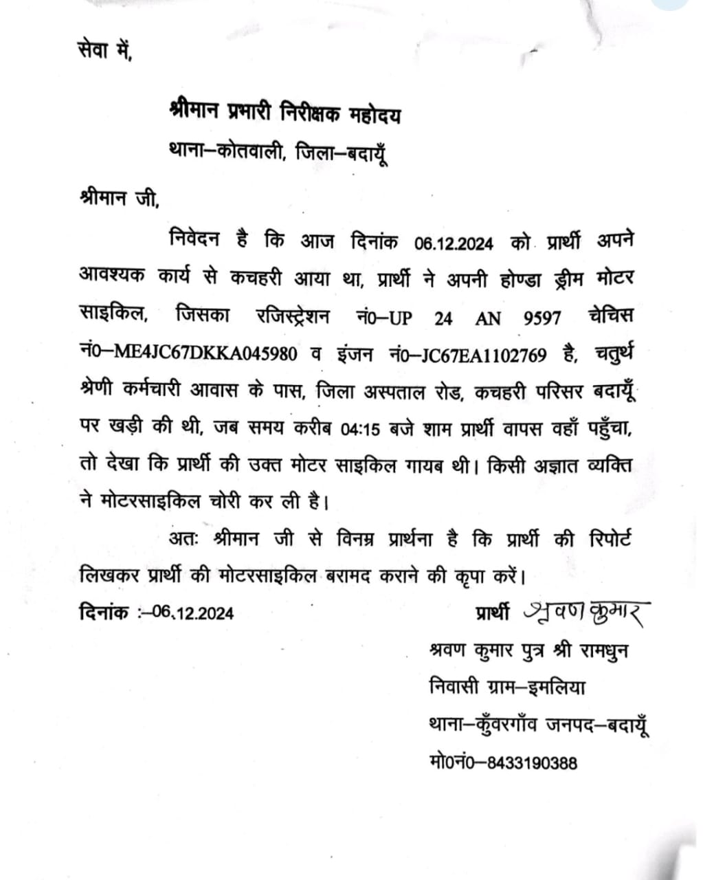 शुक्रवार को इमलिया निवासी श्रवण कुमार पुत्र रामधुन आवश्यक कार्य से बदायूं कचहरी गए थे। जहां उन्होंने अपनी बाइक कचहरी परिसर में चतुर्थ श्रेणी आवास के पास खड़ी कर दी थी ।काम निपटाने के बाद वह जब शाम चार बजे वापस पहुंचे तो उन्हें बाइक वहां गायब मिली जिसके बाद श्रवण कुमार ने थाना कोतवाली में अज्ञात चोर के खिलाफ तहरीर देकर रिपोर्ट दर्ज करने की मांग की है पुलिस मामले की जांच कर रही है ।