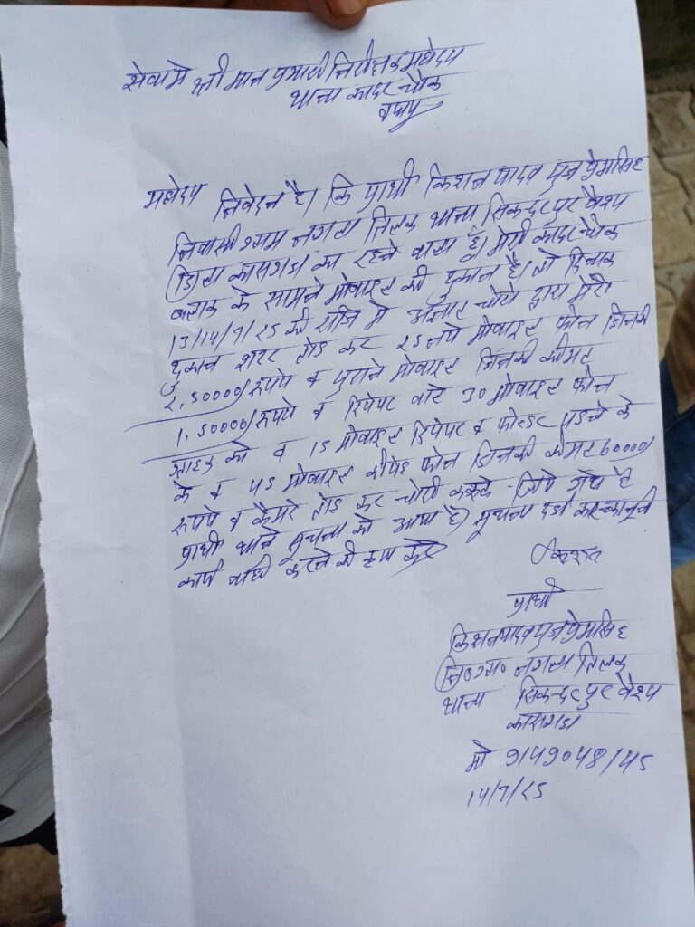 बजे दुकान खोली तो देखा दुकान का सामान तितर-बितर था। उन्होंने बताया उनकी दुकान से 25 नए मोबाइल कीमत लगभग ढाई लाख रुपए, पुराने मोबाइल जिनकी कीमत डेढ़ लाख रुपए, रिपेयर वाले 30 मोबाइल फोन ग्राहक के, 15 मोबाइल रिपेयर फोल्डर,