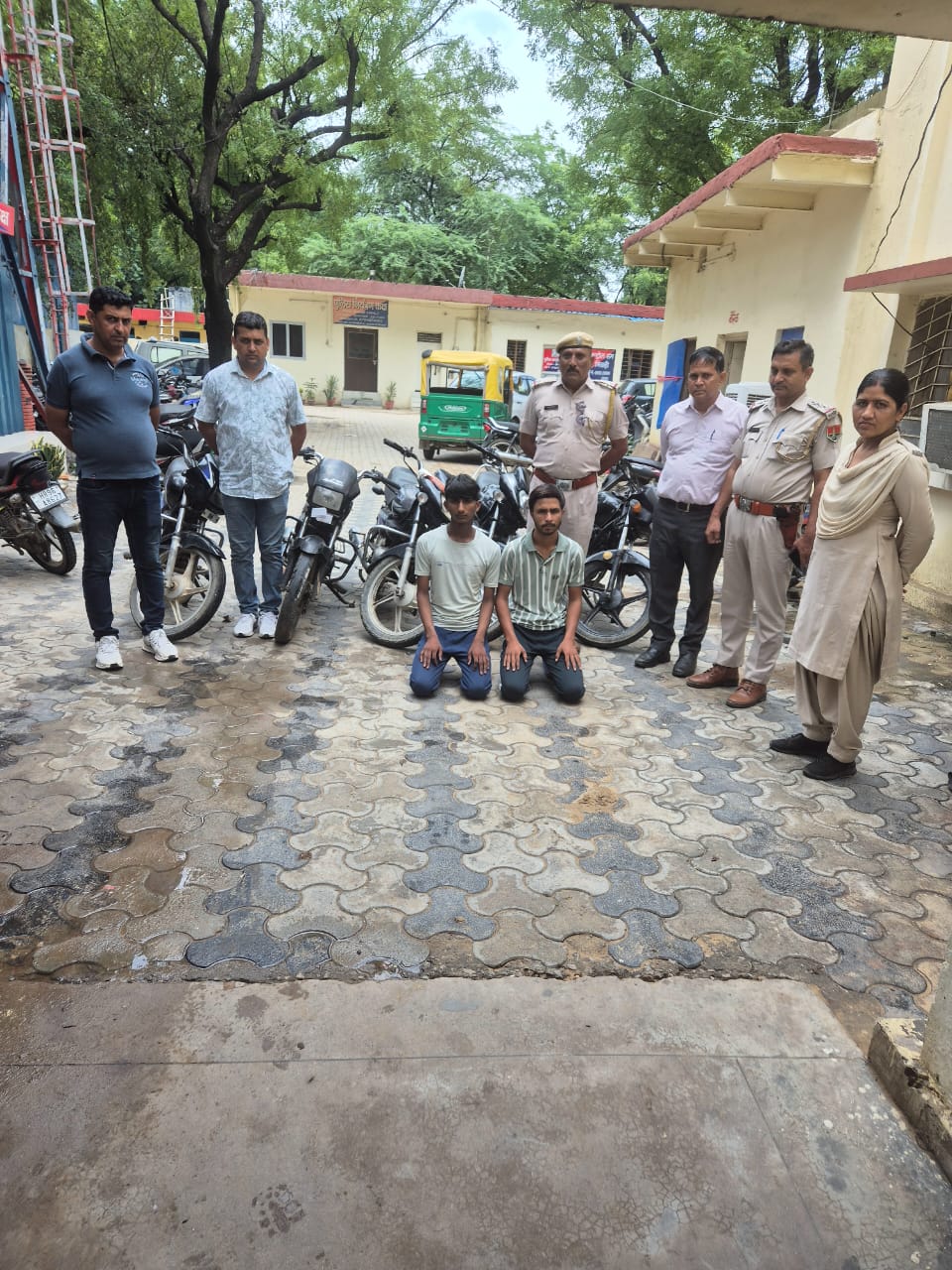 साहिद उर्फ जिलसाद उर्फ जिल्ली पुत्र सहीद मेव निवासी व इकलास पुत्र फकरू मेव निवासी पंचगावा थाना सदर तावडू नूंह मेवात को गिरफ्तार किया है। उनके कब्जे से चोरी की दो मोटरसाइकिल व अन्य प्रकरणों की मोटरसाइकिल सहित कुल पांच वाहन बरामद किये हैं।