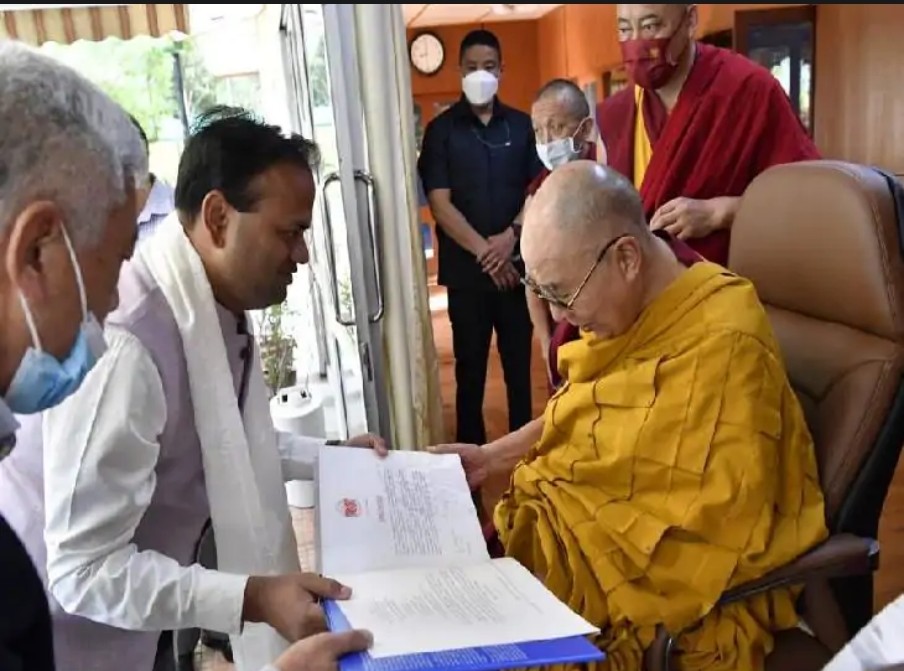 दलाई लामा को अपनी पुस्तक भेंट करते इस रविंद्र कुमार..