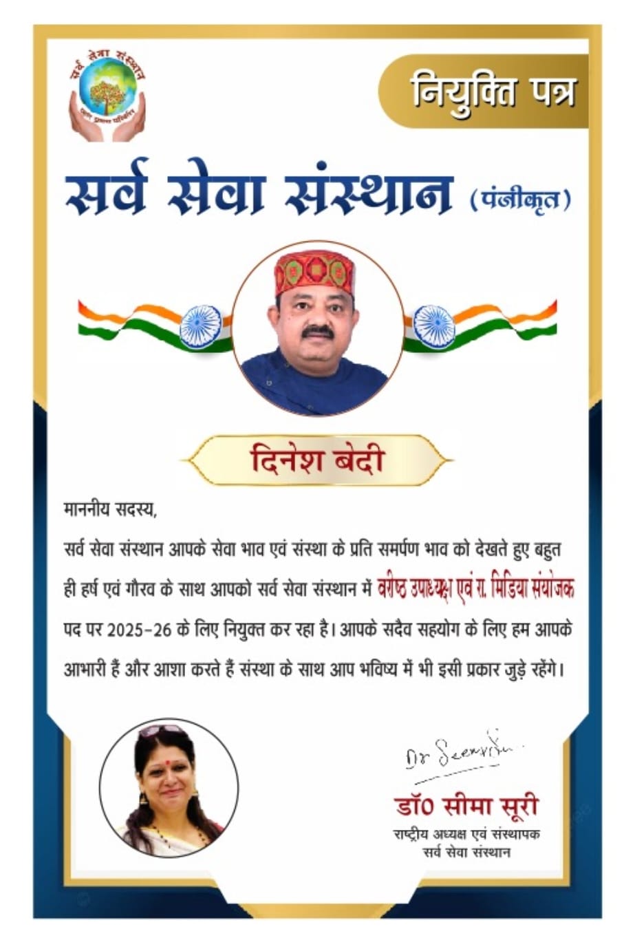 कई समाजसेवी भी राष्ट्रीय कार्यकारणी में लिए गए जिसमें भिवाड़ी के भी समाज सेवक दिनेश बेदी को उनकी समाज सेवा के प्रति संकल्प एवं निस्वार्थ कार्यों को देखते हुए एक बार फिर सर्व सेवा संस्थान रजिस्टर्ड का राष्ट्रीय वरिष्ठ उपाध्यक्ष एवं राष्ट्रीय मीडिया प्रभारी बनाया गया, भिवाड़ी के दिनेश बेदी भारतीय सेना के