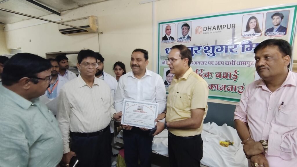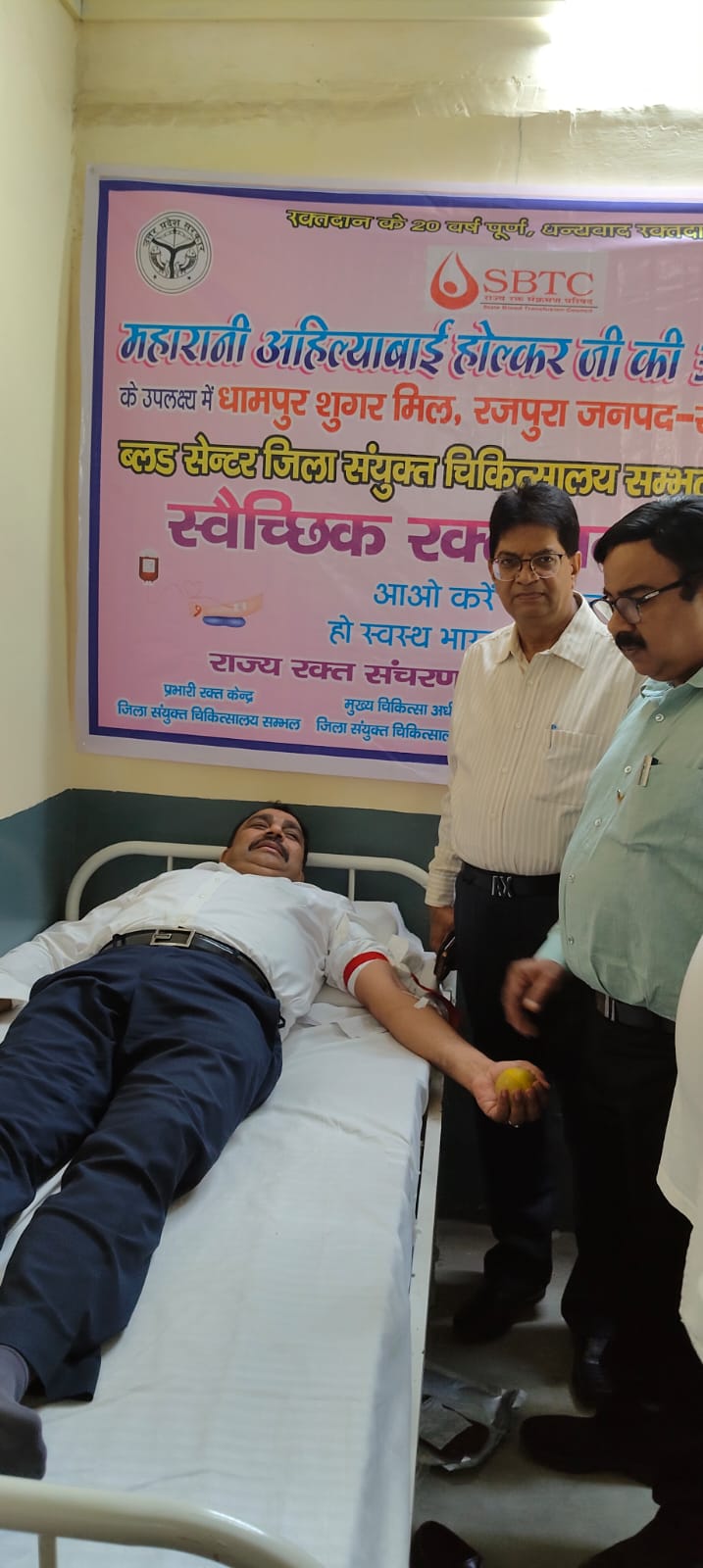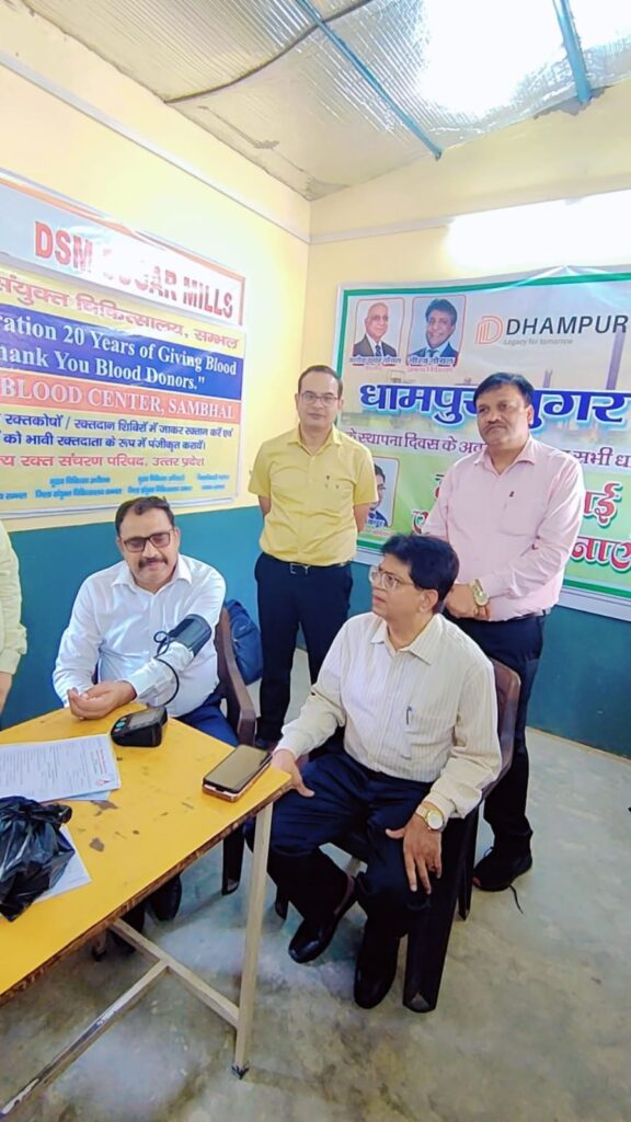 सम्भल । धामपुर शुगर मिल के स्थापना दिवस के अवसर पर कारखाने में ब्लड कैंप का आयोजन किया गया है,जिसमें मुख्य चिकित्सा अधिकारी तरुण पाठक मुख्य चिकित्सा अधीक्षक राजेंद्र सिंह डॉक्टर मनोज