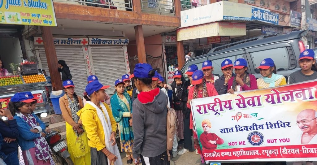 भिवाड़ी। भिवाड़ी के समीप राजकीय कन्या महाविद्यालय टपूकड़ा में शनिवार से चल रहे राष्ट्रीय सेवा योजना के सात दिवसीय विशेष शिविर के छठवें दिन की शुरुआत स्वयंसेविकाओ ने योग व प्राणायाम से की। आज का शिविर मुख्य रूप से समाज में फैल रही दहेज प्रथा व बेटियों की शिक्षा को लेकर समर्पित रहा। स्वयंसेविका रिंकू बिसारिया, सुषमा, निकिता, किरण, नेहा, अनु, ज्योति, सिमरन, वर्षा आदि ने दो समूह में विभक्त होकर कस्बे के मुख्य मुख्य स्थानो पर नुक्कड़ नाटक के माध्यम से दहेज प्रथा बुराई से बचने व