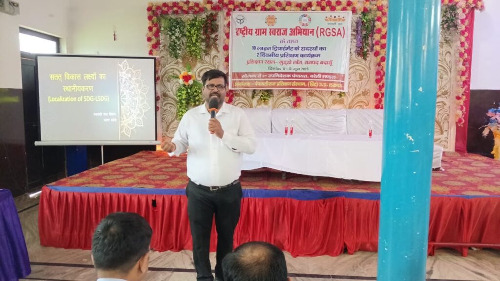 पंचायत रिसोर्स सेंटर अमरोहा से सतेन्द्र शर्मा ने उपस्थित खंड स्तरीय अधिकारियों को सतत विकास लक्षय एवं स्थानीय सतत विकास लक्षय प्राप्ति की विशेष जानकारी दी गई। श्री शर्मा ने कहा कि 17 सतत विकास लक्ष्यों की प्राप्ति हेतु ग्राम पंचायतें अग्रसर है। ग्राम पंचायत सतत