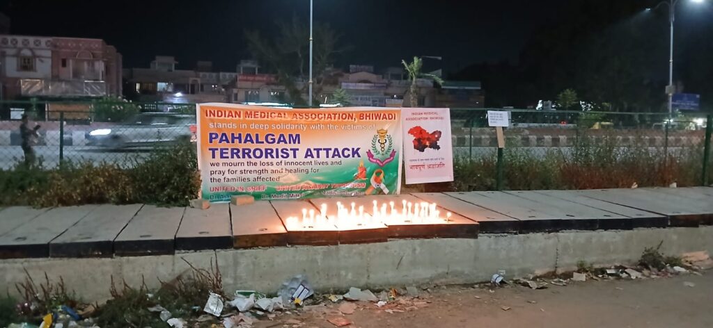 भिवाड़ी। 25 अप्रैल की शाम को औद्योगिक क्षेत्र भिवाड़ी में इंडियन मेडिकल एसोसिएशन के आवाहन पर पहलगाम आतंकी हमले के शिकार लोगों के लिए