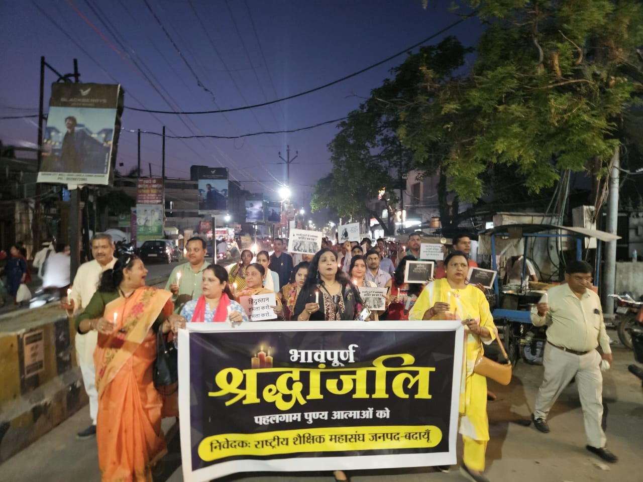 बदायूं। पहलगाम में हुए दहसतगरदों द्वारा निर्दोष लोगों के साथ किए गए निर्मम हत्याकांड को लेकर राष्ट्रीय शैक्षिक महासंघ जनपद बदायूं के तत्वाधान में जिला संयोजक दुष्यंत रघुवंशी के नेतृत्व में गुस्साए समस्त शैक्षिक समाज ने अपना विरोध प्रदर्शन करते हुए राष्ट्रीय शैक्षिक महासंघ कार्यालय सिविल लाइन्स से भामाशाह चौक तक पैदल शांति मार्च किया एवम भामाशाह चौक