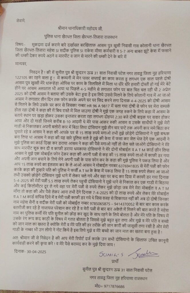 खैरथल। शहर के पुलिस कर्मीयो एव खैरथल डी एस टी टीम पर अपहरण, फिरौती व धमकी का गंभीर आरोप हरियाणा के तावडू निवासी सुनील ने चोकाने वाला