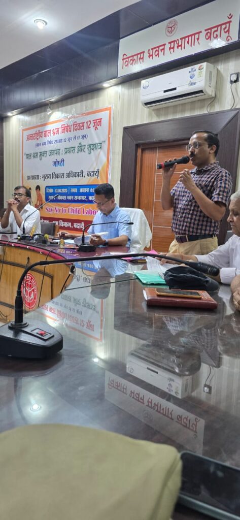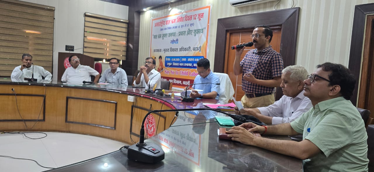 बदायूं।अंतराष्ट्रीय बाल श्रम निषेध दिवस 12 से 17 जून बालश्रम निषेध सप्ताह के उपलक्ष्य में शुक्रवार को मुख्य विकास अधिकारी की अध्यक्षता में ” बाल श्रम मुक्त जनपद: प्रयास और सुझाव” विषय पर गोष्ठी आयोजित की गई। गोष्ठी में सभी स्टेकहोल्डर्स यथा जिला प्रोबेशन अधिकारी, जिला दिव्यांग जन सशक्तीकरण अधिकारी, डिप्टी सीएमओ, अध्यक्ष बाल कल्याण समित