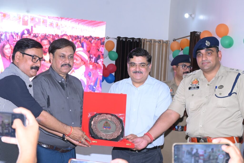 कार्यक्रम में डीजीपी द्वारा भेजे गए प्रतीक चिन्ह को प्रदान करते एडीजी रमित शर्मा,जिलाधिकारी अविनाश सिंह,वरिष्ठ पुलिस अधीक्षक अनुराग आर्य..