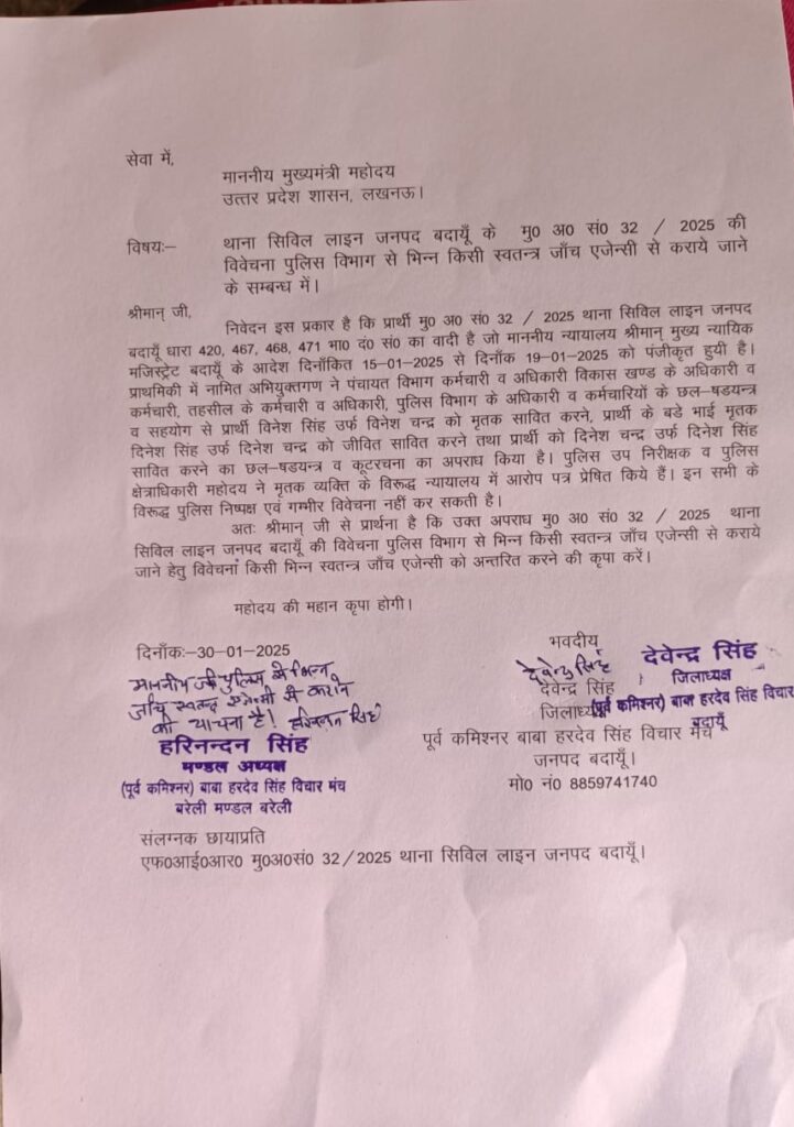 बदायूं। पूर्व कमिश्नर बाबा हरदेव सिंह विचार मंच ने भगवतीपुर मामले में की जांच स्वतंत्र एजेंसी से कराने की मांग करते हुए लिखा मुख्यमंत्री को पत्र वही आपको बता दें कि बीते दिनों भगवतीपुर के मामले में बदायूं न्यायालय के आदेश पर सिविल लाइंस थाने में छः लोगों के खिलाफ संगीन धाराओं में मुकदमा दर्ज हुआ था।