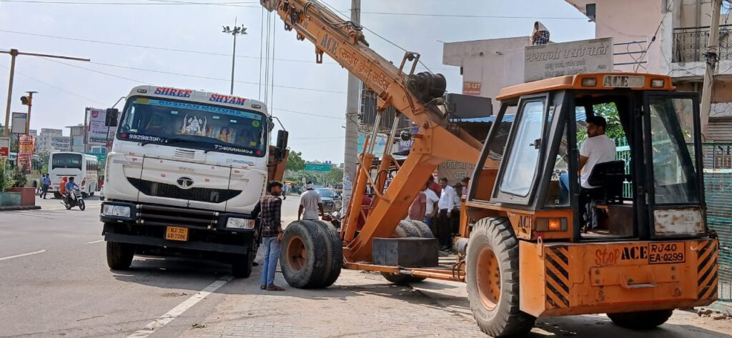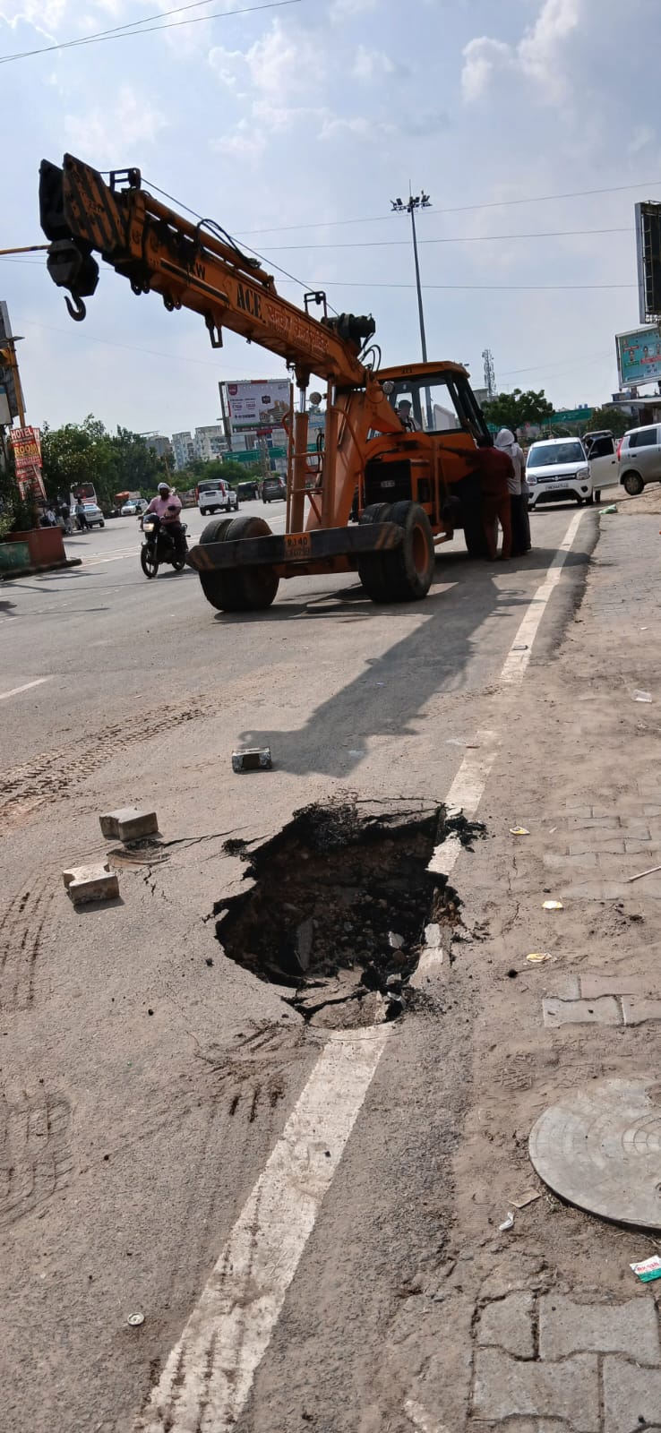 भिवाड़ी। मंशा चौक भिवाड़ी के गौरव पथ पर एक ट्रेलर गुजरते समय धंस गई सड़क। जिससे ट्रेलर उसमें फंस गया। तीन हाईड्रा मशीन लगाकर ट्रेलर को बाहर