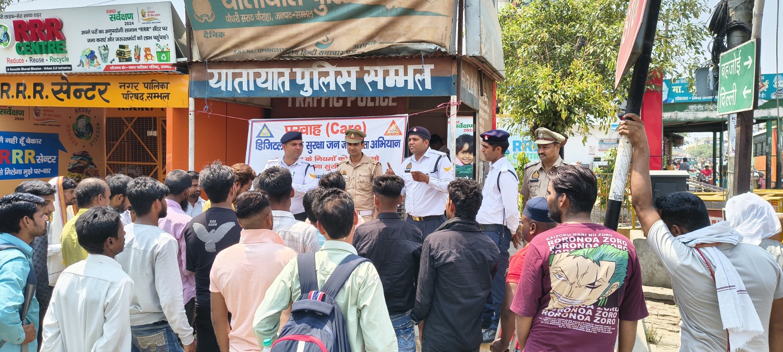 सम्भल। पुलिस अधीक्षक कृष्ण कुमार बिश्नोई के कुशल निर्देशन एवं क्षेत्राधिकारी यातायात के नेतृत्व में यातायात जागरूकता एवं डिजिटल रोड सेफ्टी अभियान ,परवाह”Care, के अंतर्गत, यातायात प्रभारी दुष्यंत बालियान और मुख्य आरक्षी सचिन कुमार और मुख्य आरक्षी विशांतकुमार के द्वारा यात्रियों को सड़क सुरक्षा के बारे में बताया गया है,जिसमें मुख्य रूप से यातायात के नियम के बारे में बताया गया है,कि दो पहिया वाहन पर हेलमेट का प्रयोग करेंगे और चार पहिया वाहन चलाते समय सीट बेल्ट का प्रयोग करेंगे, शराब के नशे में वाहन नहीं चलाएंगे और नींद आने पर वाहन नहीं चलाएंगे खतरनाक ढंग से वाहन नहीं चलाएंगे, 18 वर्ष से कम उम्र के व्यक्ति वाहन नहीं चलाएंगे, जिनका ड्राइविंग लाइसेंस नहीं बना है वह भी वाहन नहीं चलाएंगे, पैदल यात्री भी यातायात नियमों का पालन करेंगे चौराहा पार करते समय दाएं बाएं देखेंगे, उसके बाद चौराहा पार करेंगे और रात्रि में वाहन चलाते समय