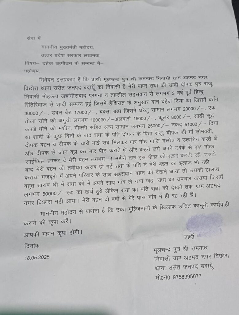 का इलाज भी नहीं कराया तब मजबूर होकर प्रार्थी अपने परिवार के साथ सहसवान मोहल्ला जहांगीराबाद आया और अपनी बहन राधा को अपने गांव ले गया और बहन का इलाज एक नर्सिंग होम में कराया जिसमें₹50000 का खर्चा आया लगभग मेरी बहन 2 वर्षों से मेरे घर पर ही रह रही है मेरी बहन का पति दीपक बुलाने के लिए आज तक नहीं आया है मजबूर होकर प्रार्थना पत्र दे रहा हूं महोदय से निवेदन है उक्त मुलजिमो के विरुद्ध कानूनी कार्रवाई करवाने का कष्ट करें।