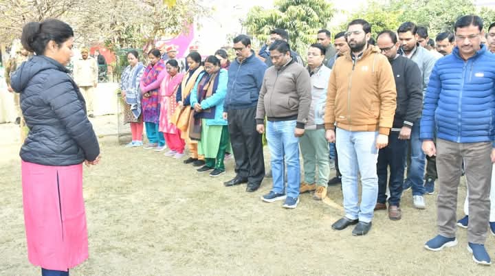गुरुवार को कलेक्ट्रेट परिसर स्थित शहीद पार्क में जिलाधिकारी निधि श्रीवास्तव ने अधिकारियों एवं कर्मचारियों के साथ दो मिनट का
