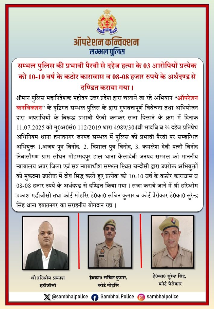 संभल। यूपी के जनपद सम्भल में अवगत कराना है कि दिनांक 02.04.2019 को थाना हयातनगर पर वादी प्रेम सिंह की तहरीरी सूचना कि अभियुक्तों द्वारा अतिरिक्त दहेज के वादी की पुत्री को प्रताडित करना तथा वादी की पुत्री की फांसी लगाकर हत्या कर देने के सम्बन्ध में थाना हयातनगर पर सुसंगत धाराओं में अभियोग पंजीकृत किया गया था, दिनांक 11.07.2025 को मु0अ0सं0 112/2019 धारा 498ए/304बी भादवि व ¾ दहेज
