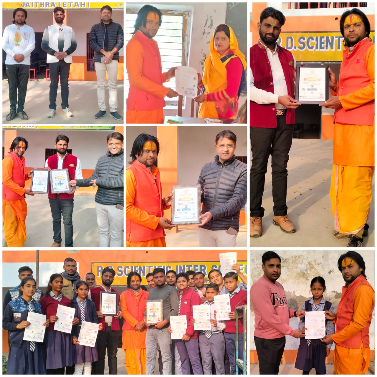 जैथरा: योगाचार्य पं विशाल मिश्रा संस्थापक भगवा हिन्द वाहिनी ने आर डी साइंस्टिफिक इंटर कॉलेज के अकादमी निदेशक एवं प्रधानाचार्य को प्रशस्ति प्रमाणपत्र देकर सम्मानित किया भगवा हिन्द वाहिनी द्वारा राष्ट्रीय भगवा योगशाखा का आयोजन कर प्रत्येक विद्यालय में जाकर निरंतर योग अभ्यास कराया जा रहा है जिसके चलते जनपद एटा के नगर जैथरा में आर डी साइंस्टिफिक इंटर कॉलेज में भगवा हिंद वाहिनी के द्वारा राष्ट्रीय भगवा योगशाखा का आयोजन किया गया जिसमें योगाचार्य ने इक्कीस प्रकार के योग अभ्यास कराए सभी विद्यार्थियों को प्रमाण पत्र भी दिए गये भगवा हिन्द वाहिनी ने राष्ट्रीय भगवा योगशाखा के सफल आयोजन के लिए आर डी साइंस्टिफिक इंटर कॉलेज के अकादमी निदेशक डॉ ब्रह्मराज सिंह एवं प्रधानाचार्य प्रदीप कुमार उर्फ़ राहुल जी को प्रशस्ति पत्र प्रदान कर सम्मानित किया, जिसमे समस्त शिक्षक व् योग गुरु एवं शिष्य शिष्याएं उपस्थित रही योगाचार्य ने कहा कि जो स्नेह और प्यार हमें विद्यार्थियों ने प्रदान किया। उसके लिए सदैव आभारी रहूँगा और बताया कि शरीर के लिए जितना भोजन की आवश्यकता है उसी प्रकार शरीर को स्वस्थ रखने के लिए योग की अति आवश्यकता है।