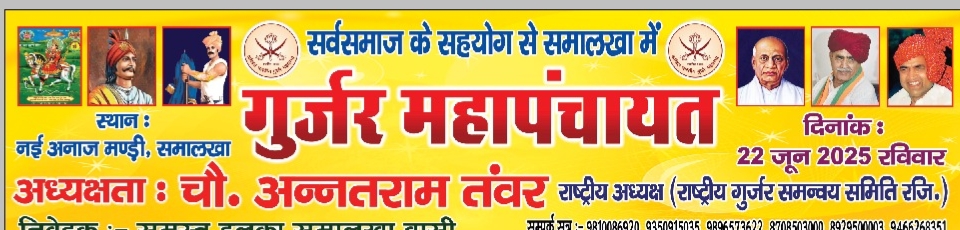 सामाजिक उत्थान के लिए,, समालखा में 22.6.2025 को गुर्जर महापंचायत आयोजित की जा रही है जिसमें समस्त उतर भारत के समाजसेवी भाग लेंगें।और लगभग दस हजार प्रतिनिधि भाग लेंगें।