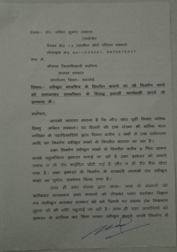 सम्भल । वरिष्ठ अधिवक्ता एवं आर.टी.आई.एक्टिविस्ट डॉ अमित कुमार उठवाल के जिलाधिकारी राजेंद्र पेंसिया सम्भल सहित सभी अधिकारियों को पत्र प्रेषित कर अबगत कराया है,कि सम्भल के मोह कोट पूर्वी निकट कल्कि विष्णु मंदिर के पास मैं दिल्ली की एक संस्था श्री