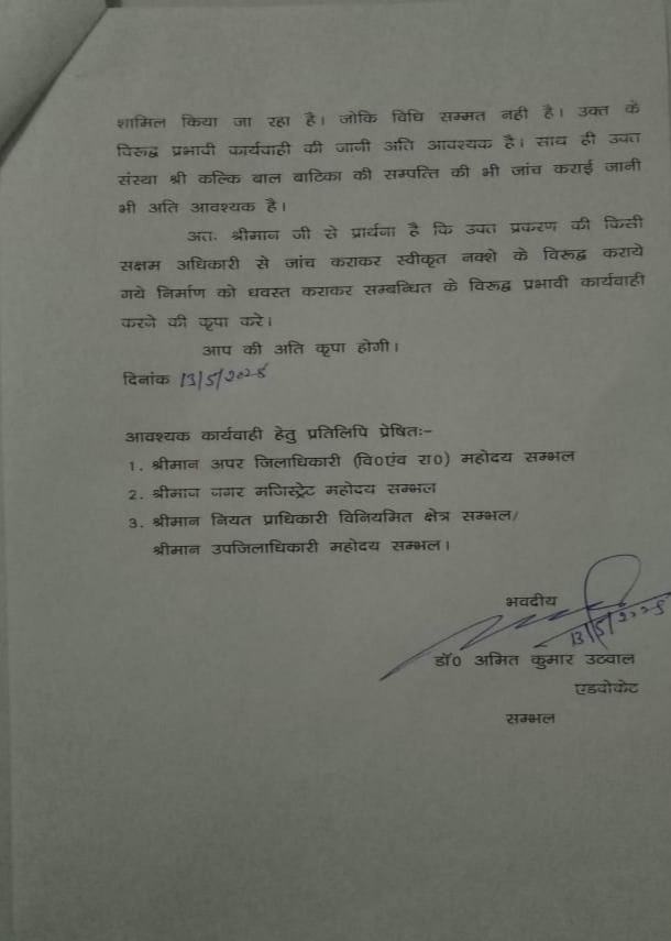 कल्कि बाल वाटिका जिसका कल्कि विष्णु मंदिर सम्भल से कोई वास्ता नहीं है विगत लगभग 3 वर्षों से धर्मशाला आदि का निर्माण कर रही है उक्त निर्माण विधि विरुद्ध तरीके से लगभग 8 फीट खनन करके बहुमंजिला इमारत का निर्माण किया जा रहा है,उक्त निर्माण स्वीकृत नक्शे के विपरीत किया जा रहा है, उक्त निर्माण में ना तो सेटबैक छोड़ा जा रहा है और ना ही रोड बाइंडिंग छोड़ी