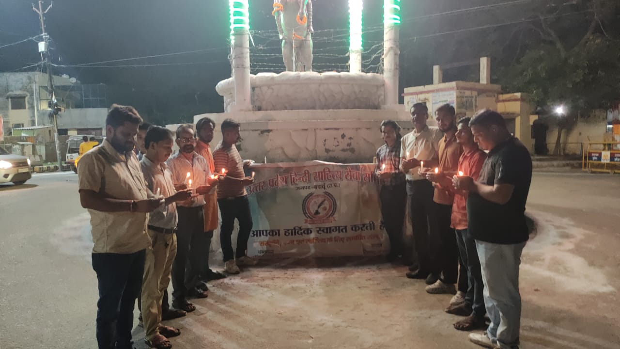 बदायूं : उत्तर प्रदेश हिंदी साहित्य सेवा समिति के सभी पदाधिकारी एवं सदस्यों ने वीरांगना चौक पर दो मिनट का मौन रखकर एवं कैंडल जलाकर विमान हादसे में दिवंगत यात्रिओं की आत्माओ की शान्ति के लिए कैंडल जलाकर एवं दो मिनट का मौन रखकर श्रदांजलि दी।