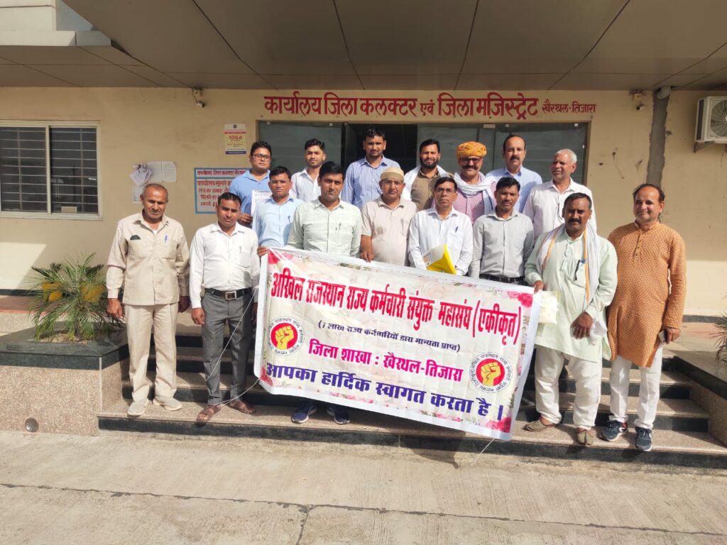 खैरथल। प्रदेश कार्यकारिणी के आव्हान के तहत अखिल राजस्थान राज्य कर्मचारी सयुक्त महासंघ खैरथल द्वारा कर्मचारियों के 17 सूत्रीय मांग पत्र मुख्यमंत्री के नाम जिला कलेक्टर खैरथल के माध्यम से ज्ञापन दिया गया। महासंघ के जिला संयोजक करण सिंह गुर्जर के नेतृत्व में, महासंघ के समस्त घटक संघटन के पदाधिकारियों /कर्मचारियों ने भाग लिया। जिला