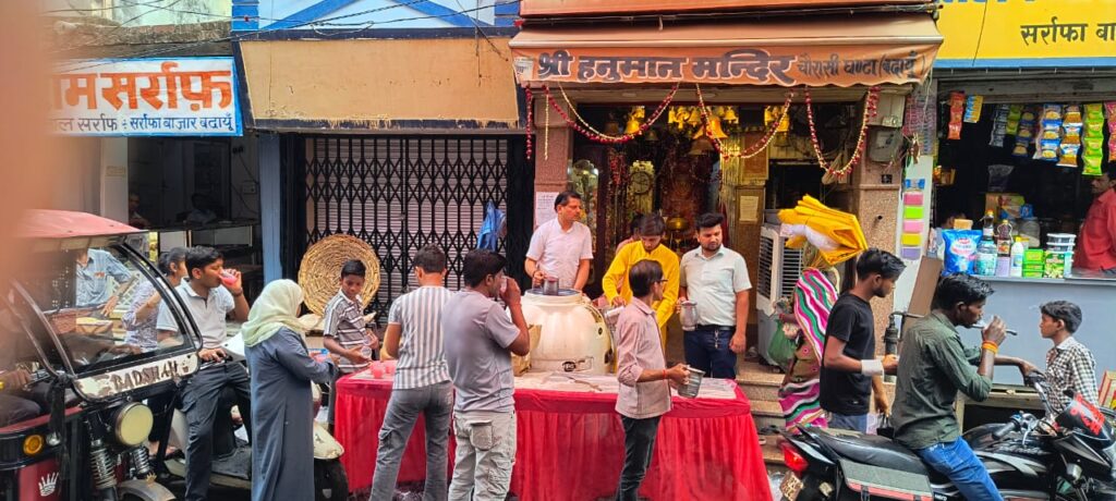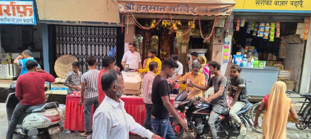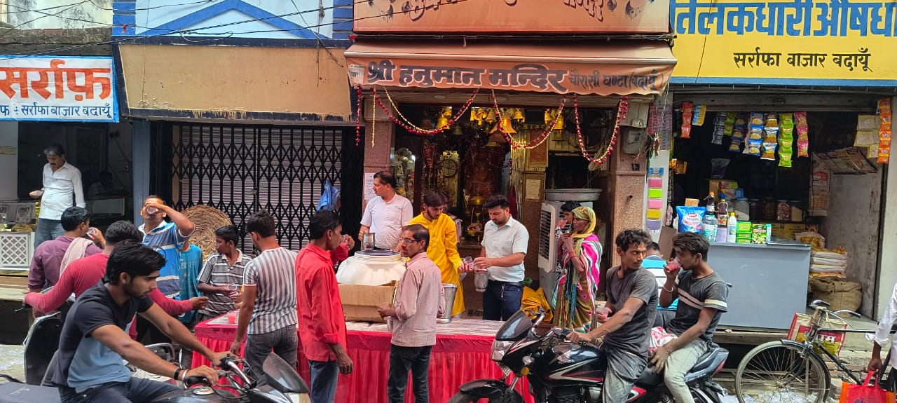 बदायूं। सर्राफा बाजार स्थित 84 घंटा हनुमान मंदिर पर आज मंगलवार को जेठ के चौथे बड़े मंगलवार पर जेठ की दुपहरी में गर्मी से व्याकुल राहगीरों को दूध और गुलाब रस का शरबत वितरण किया गया। राहगीर भक्तों ने शरबत पीकर प्यास बुझाई. जय श्री राम, जय हनुमान के जयकारों से वातावरण भक्तिमय हो गया।