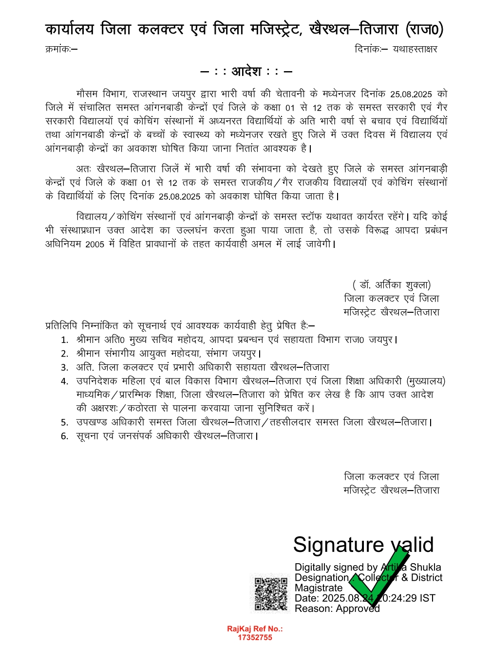 खैरथल-तिजारा, 24 अगस्त। जिला कलक्टर एवं जिला आपदा प्रबंधन प्राधिकरण के अध्यक्ष डॉ. आर्तिका शुक्ला ने मौसम विभाग द्वारा जारी जिले में अति वर्षा की चेतावनी एवं पूर्वानुमान को मध्यनजर रखते हुए आदेश जारी कर जिले के समस्त आंगनबाडी केंद्रों एवं कक्षा 1 से 12 तक के समस्त राजकीय एवं गैर राजकीय विद्यालयों में आपदा प्रबंधन अधिनियम 2005 के अंतर्गत प्रदत्त शक्ति का प्रयोग करते हुए 25 अगस्त को अवकाश घोषित किया है।