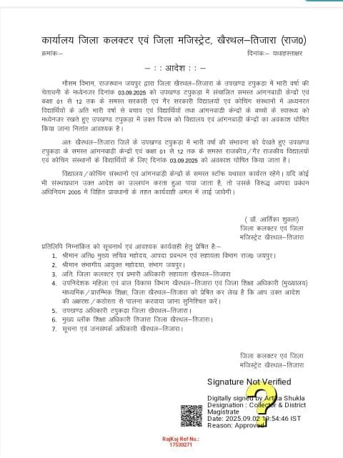 खैरथल-तिजारा, 2 सितम्बर। जिला कलक्टर एवं जिला आपदा प्रबंधन प्राधिकरण के अध्यक्ष डॉ. आर्तिका शुक्ला ने मौसम विभाग द्वारा जारी अति वर्षा की चेतावनी एवं पूर्वानुमान को मध्यनजर रखते हुए आदेश जारी कर उपखंड टपूकड़ा के समस्त आंगनबाडी केंद्रों