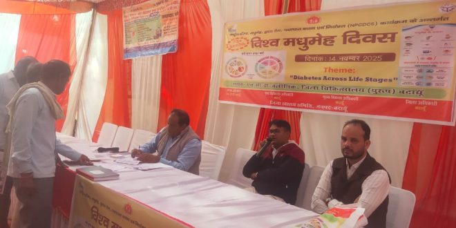 बदायूँ । मुख्य चिकित्सा अधिकारी के दिशा-निर्देशन में राष्ट्रीय स्वास्थ्य मिशन, उ0प्र0 के तत्वाधान में ’विश्व मधुमेह दिवस’ 14, नवम्बर, 2025 के अवसर पर चिकित्सा एवं परामर्श शिविर का आयोजन जिला चिकित्सालय पुरूष में शुक्रवार को प्रातः 10ः30 बजे किया गया, जिसमें , डा० अमित वार्ष्णेय मुख्य चिकित्सा अधीक्षक जिला चिकित्सालय (पुरूष) बदायॅू, डा0 निरंजन सिंह, नोडल अधिकारी-एन0सी0डी0 कार्यक्रम, डा0 स्वतंत्रपाल सिंह, फिजीशियन, मो0 इलयास, प्रेम बाबू, हरेन्द्र बाबू, पवन, अनुज, शशि गंगवार एवं अन्य कर्मचारियों द्वारा प्रतिभाग किया गया।
