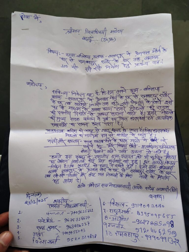 मंगलवार को लगभग एक दर्जन ग्रामीणों ने बदायूं डीएम कार्यालय पहुंचकर प्रार्थना पत्र देकर सीसी रोड की मांग की है