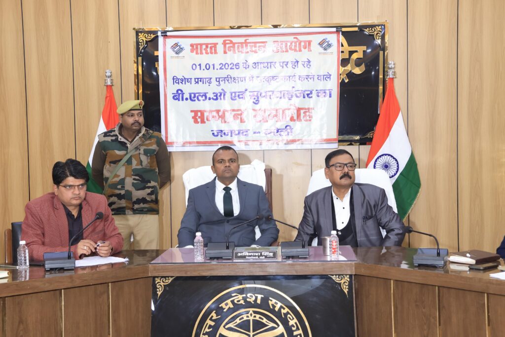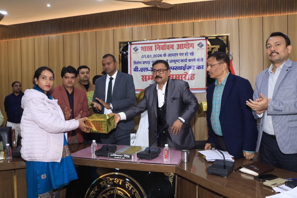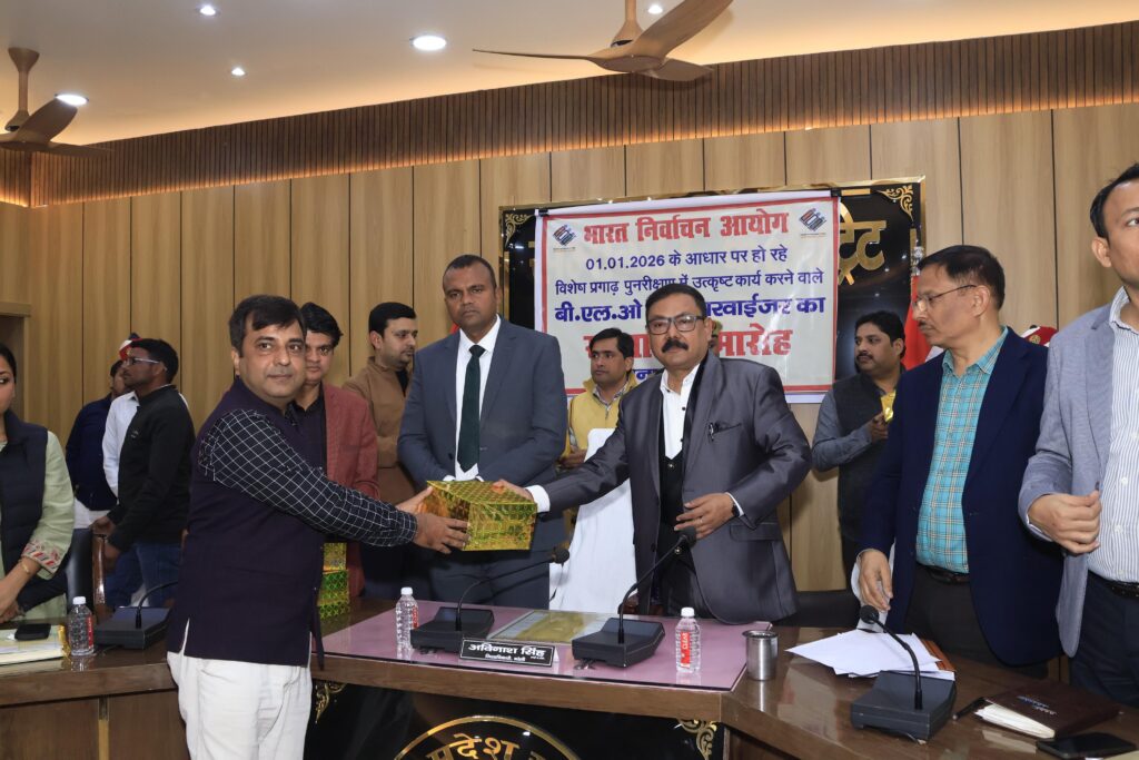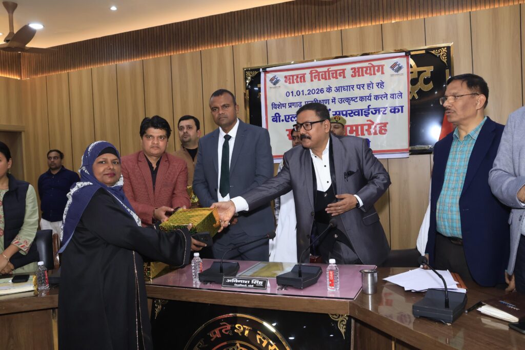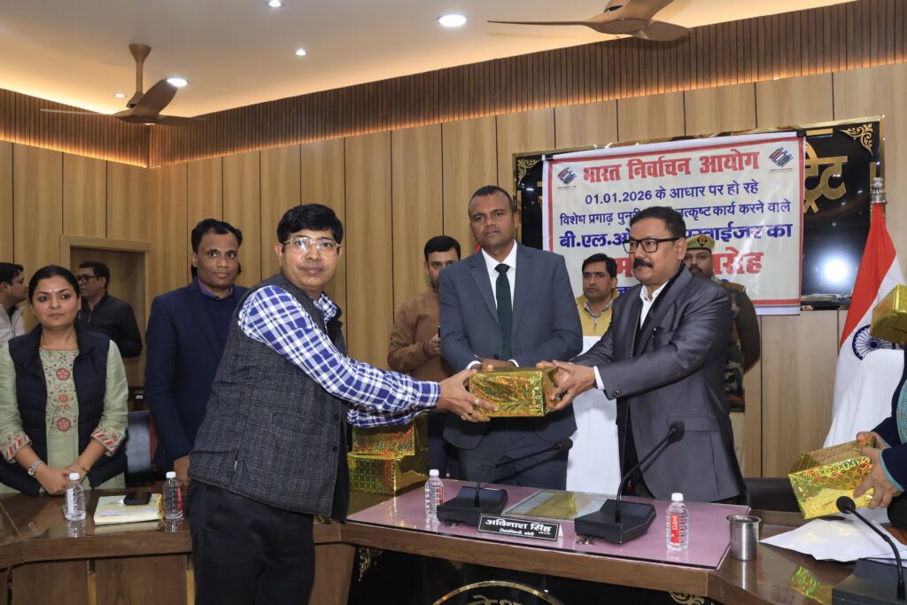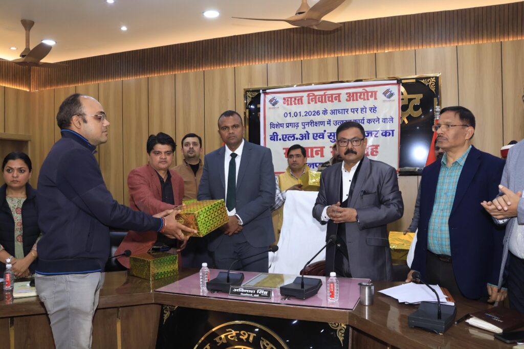 भारत निर्वाचन आयोग द्वारा 01.01.2026 को आधार मानकर चल रहे विशेष प्रगाढ़ पुनरीक्षण (Special Intensive Revision – SIR) में उत्कृष्ट कार्य करने वाले बीएलओ व सुपरवाइजरों को आज मंडलायुक्त भूपेंद्र एस. चौधरी तथा जिलाधिकारी/जिला निर्वाचन अधिकारी अविनाश सिंह ने सम्मानित किया। कार्यक्रम में सभी विधानसभा क्षेत्रों से श्रेष्ठ कार्य करने वालों को पुरस्कार व प्रशस्ति पत्र प्रदान किए गए।