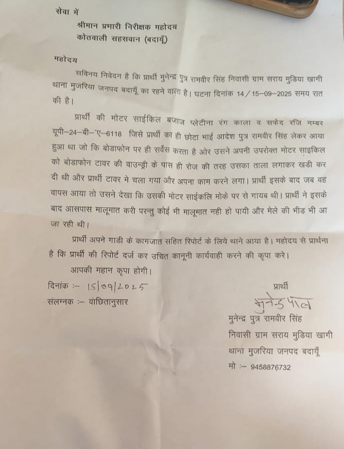 सहसवान, वोडाफोन टावर पर सर्विस करने गए एक कर्मचारी की मोटरसाइकिल चोरी होने का मामला सामने आया है। पीड़ित कर्मचारी का नाम आदेश कुमार है, सहसवान रामलीला मैदान के पास हाइवे किनारे वोडाफोन टावर पर काम कर रहा था ।
