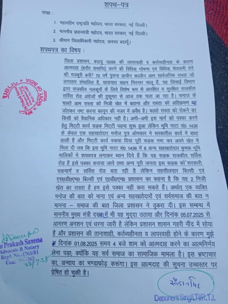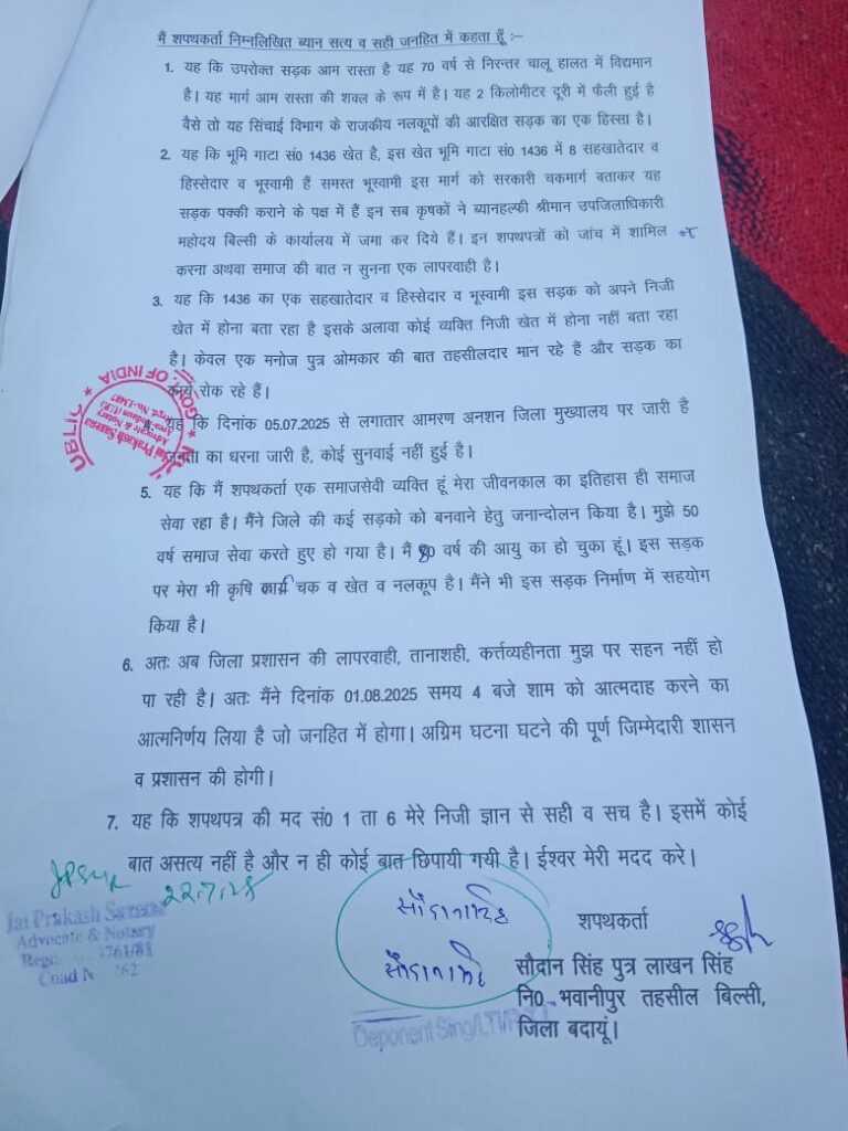 बदायूं। बिल्सी तहसील क्षेत्र के ग्राम हैदराबाद का मार्ग पक्का बनाने के लिए भारतीय किसान यूनियन की वरिष्ठ उपाध्यक्ष चौधरी सौदान सिंह ने 1 अगस्त को आत्मदाह