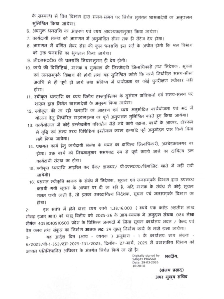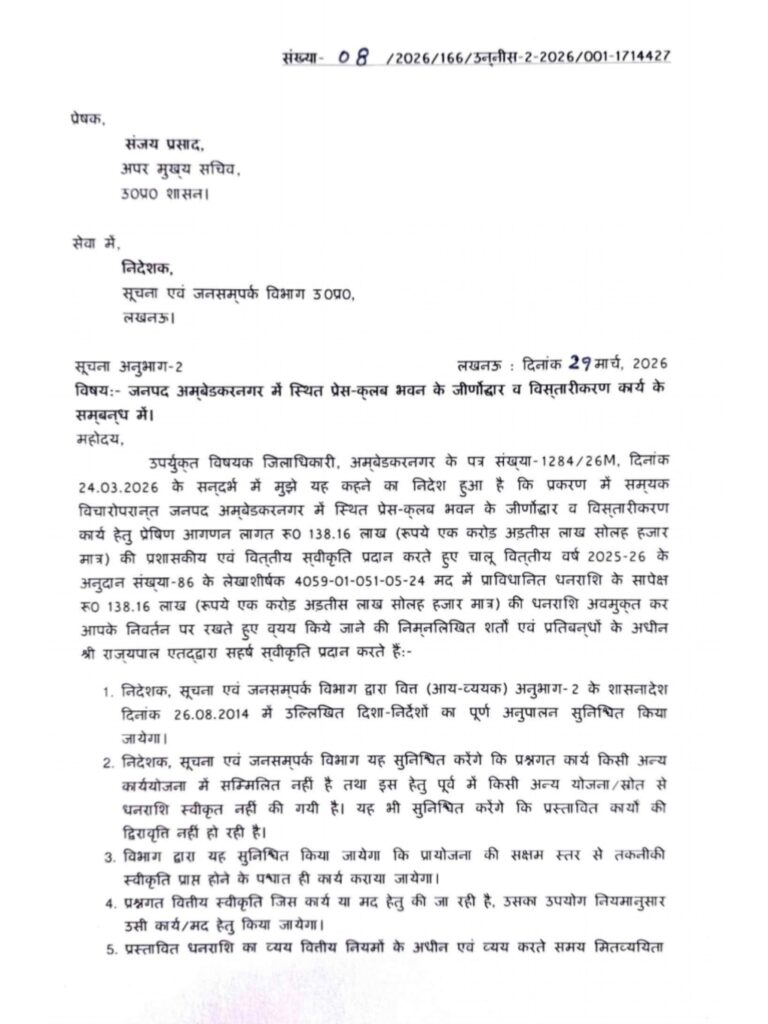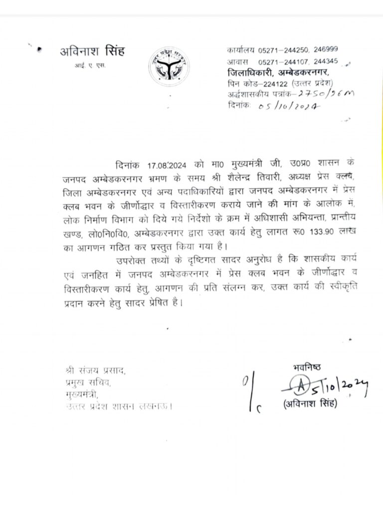 उत्तर प्रदेश में पत्रकारों के लिए एक बड़ी खुशखबरी सामने आई है। अविनाश सिंह के प्रयासों से अंबेडकर नगर प्रेस क्लब के लिए 1 करोड़ 38 लाख रुपये की धनराशि स्वीकृत की गई है। यह स्वीकृति उस समय दी गई थी जब वे अंबेडकर नगर में जिलाधिकारी के पद पर तैनात थे।