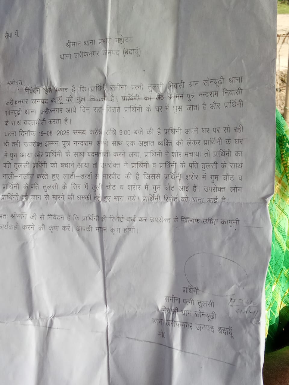 जिला बदायूं के थाना जरीफनगर क्षेत्र के गांव सोनबुढीं का है घटना दिनांक 19/08/2025 रात 9:00 बजे की है एक दबंग व्यक्ति द्वारा घर में घुसकर पति-पत्नी को लाठी डंडों से की गई मारपीट पीड़ित के सर में गंभीर