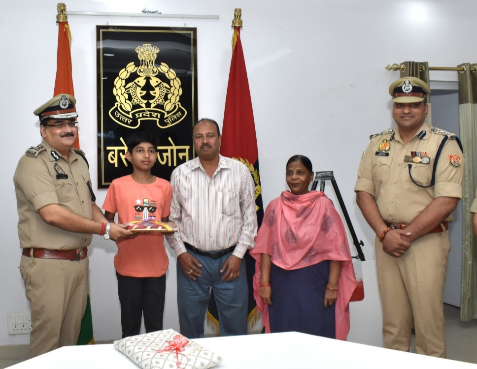 ..माता-पिता को डिजिटल अरेस्ट से बचाने वाले आठवीं कक्षा के छात्र तन्मय को सम्मानित करते एडीजी जोन रमित शर्मा और एसएसपी बरेली अनुराग आर्य..