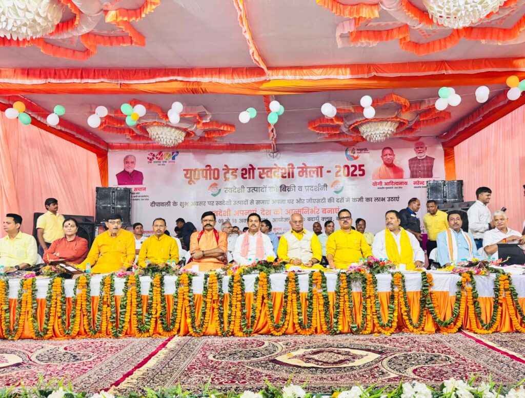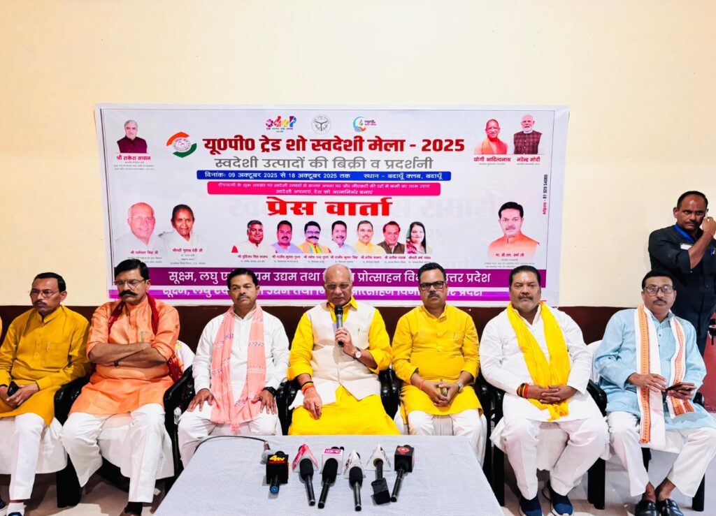 बदायूँ : 09 अक्टूबर। प्रदेश के पशुधन एवं दुग्ध विकास मंत्री धर्मपाल सिंह व केंद्रीय राज्यमंत्री बीएल वर्मा ने गुरुवार को बदायूं क्लब बदायूं में यू0पी0 ट्रेड शो स्वदेशी मेला-2025 का फीता खोलकर उद्घाटन किया। पशुधन एवं दुग्ध विकास मंत्री ने कहा कि एक भारत, श्रेष्ठ भारत, आत्मनिर्भर भारत की परिकल्पना साकार होगी। वहीं केंद्रीय राज्यमंत्री ने कहा कि आज का भारत किसी के सामने झुकने वाला भारत नहीं है। मेला आगामी 18 अक्टूबर तक संचालित रहेगा। जनप्रतिनिधियों, अधिकारियों ने मेले में लगाए गए स्टॉल का अवलोकन कर उसे सराहा।