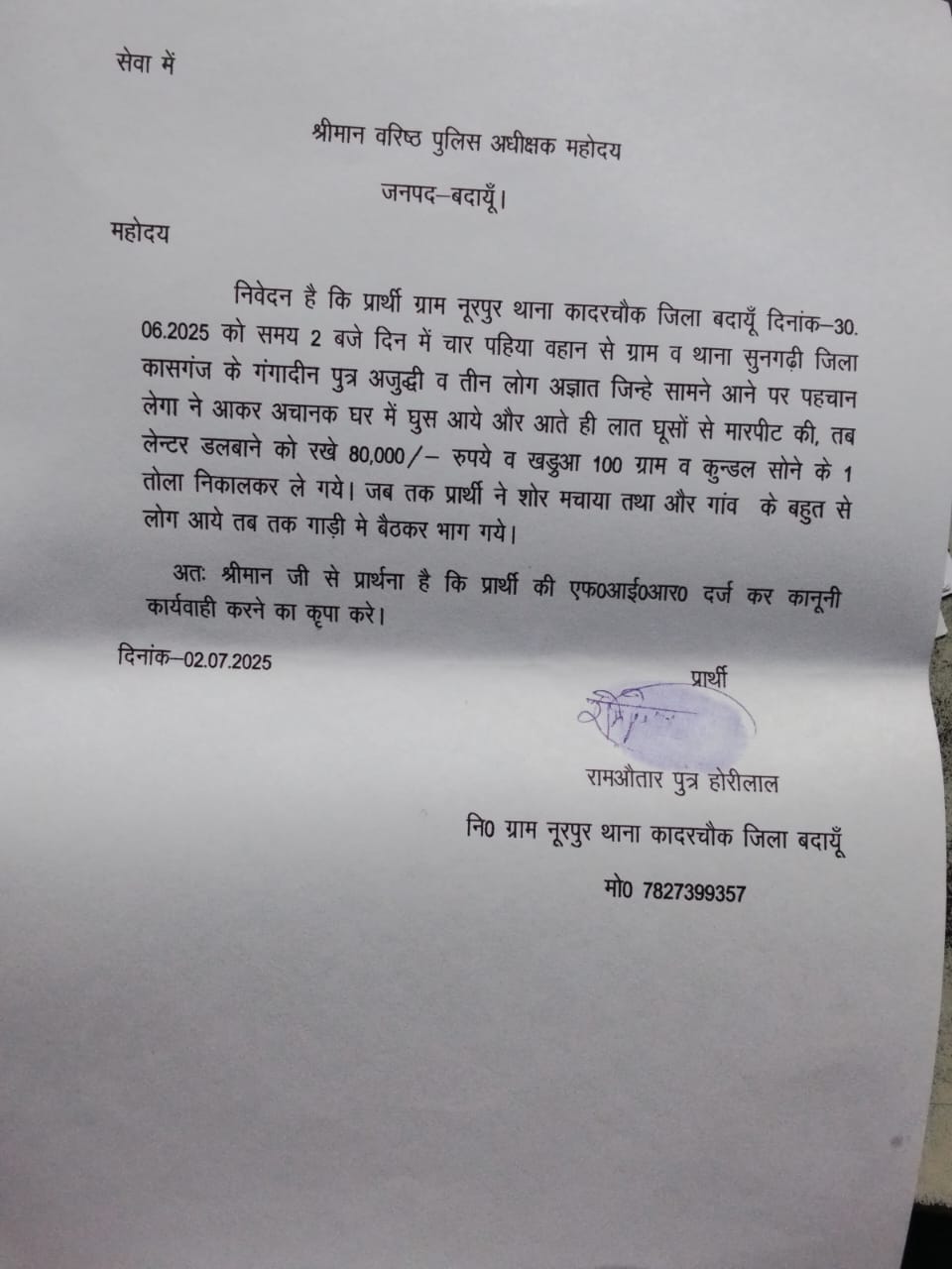 बदमाशों ने रामऔतार के घर में जबरन घुसकर मारपीट की और जान से मारने की धमकी देते हुए घर में रखा 80,000 रुपये नकद और लगभग 100 ग्राम सोना, कुल 3 तोले, जबरन लूट लिया। पीड़ित के शोर मचाने और गांव के अन्य लोगों के आने पर बदमाश मौके से फरार हो गए।