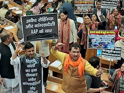 सीएनएन न्यूज भारत ब्यूरो दिल्ली :: दिल्ली नगर निगम (एमसीडी) सदन में गुरुवार को विपक्षी पार्षदों ने सत्तारूढ़ आम आदमी पार्टी (आप) पर रोहिंग्याओं और बांग्लादेशी घुसपैठियों को आश्रय देने का आरोप लगाते हुए प्रदर्शन किया। महापौर महेश खिंची अपराह्न तीन बजे तक सदन नहीं पहुंचे, जिस कारण दो बजे शुरू होने वाला सत्र अब तक शुरू नहीं हो सका, जिससे तनाव और बढ़ गया। भारतीय जनता पार्टी (भाजपा) और कांग्रेस के पार्षद सदन में आसन के समीप आ गए और बेंचों पर चढ़ गए।उनके हाथों में ‘आप’ के खिलाफ लिखे नारों की तख्तियां थीं। विपक्षी पार्षदों ने जो तख्तियां ली हुईं थीं, उनपर लिखा था, ‘अवैध रोहिंग्या और बांग्लादेशी घुसपैठिये आप’ के दोस्त हैं’, ‘झूठे केजरीवाल, शर्म करो।’ वहीं ‘मेयर साहब टाइम पे आओ’ और ‘नहीं चलेगा, ऐसे सदन नहीं चलेगा’ जैसे नारे सदन में गूंज रहे थे। विपक्षी पार्षदों ने महापौर की अनुपस्थिति की आलोचना की और सदन की कार्यवाही शुरू करने से पहले उनसे माफी की मांग की।’आप’ पार्षदों ने इसके जवाब में बाबा साहेब आंबेडकर पर संसद में केंद्रीय गृह मंत्री अमित शाह के हालिया बयान पर निशाना साधते हुए ‘बाबा साहेब का अपमान नहीं सहेंगे’ और ‘जय भीम’ जैसे नारे भी लगाए। सत्तारूढ़ पार्टी के सदस्यों ने भाजपा पर आंबेडकर की विरासत को कमजोर करने का आरोप लगाया।