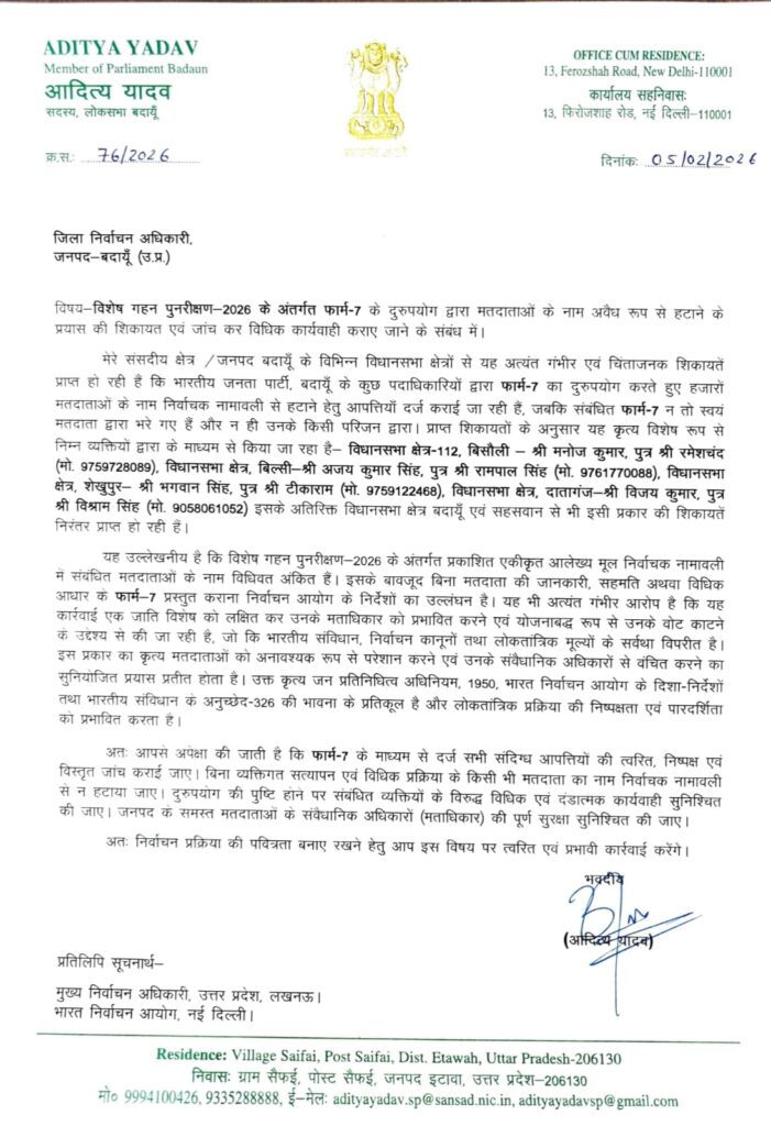 बदायूँ। संसदीय क्षेत्र से सांसद आदित्य यादव ने जिला निर्वाचन अधिकारी, बदायूँ को एक पत्र लिखकर विशेष गहन पुनरीक्षण-2026 के अंतर्गत मतदाता सूची से नाम हटाए जाने को लेकर गंभीर आरोप लगाए हैं। सांसद ने पत्र के माध्यम से फार्म-7 के कथित दुरुपयोग की शिकायत करते हुए पूरे मामले की निष्पक्ष जांच कर विधिक कार्रवाई की मांग की है।