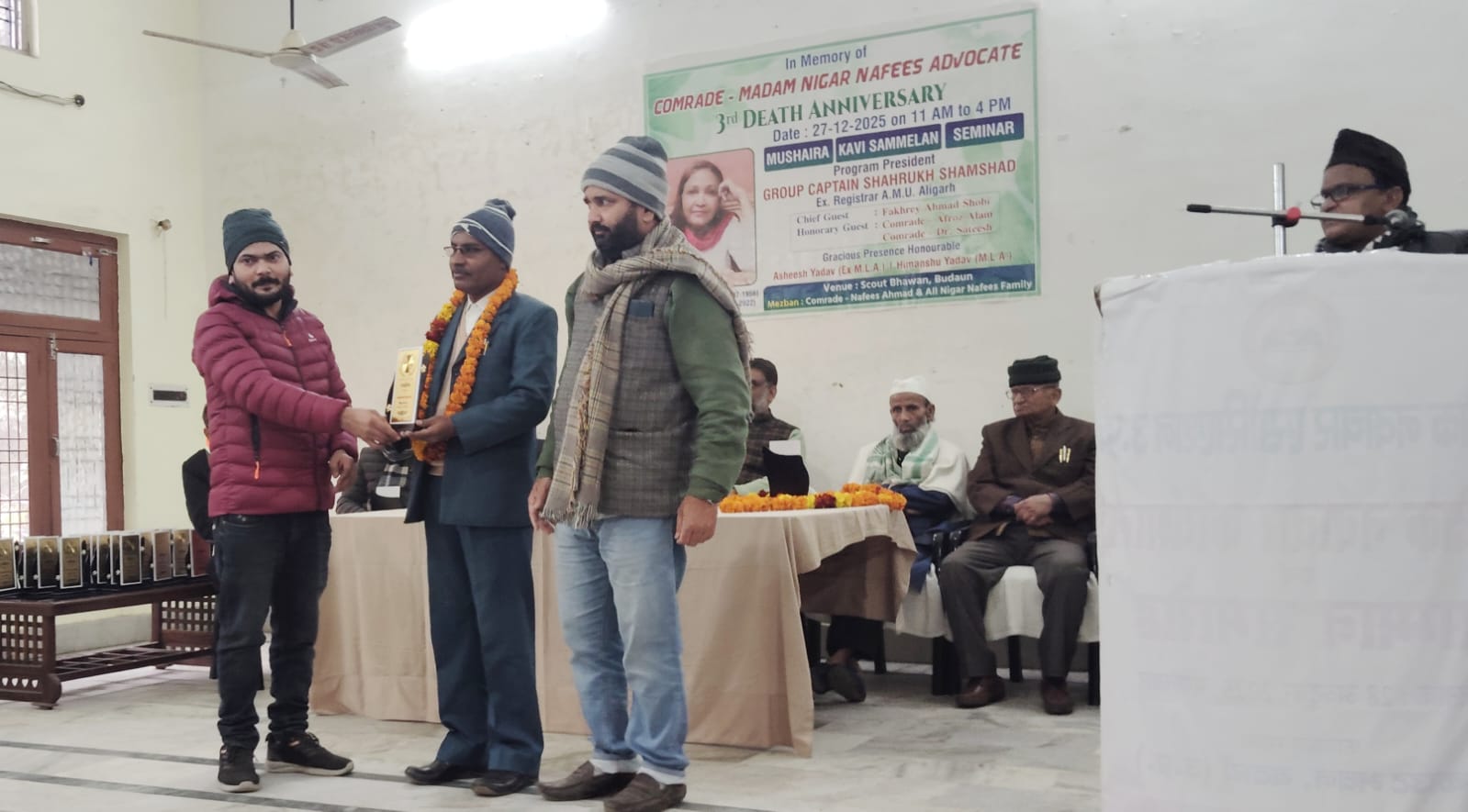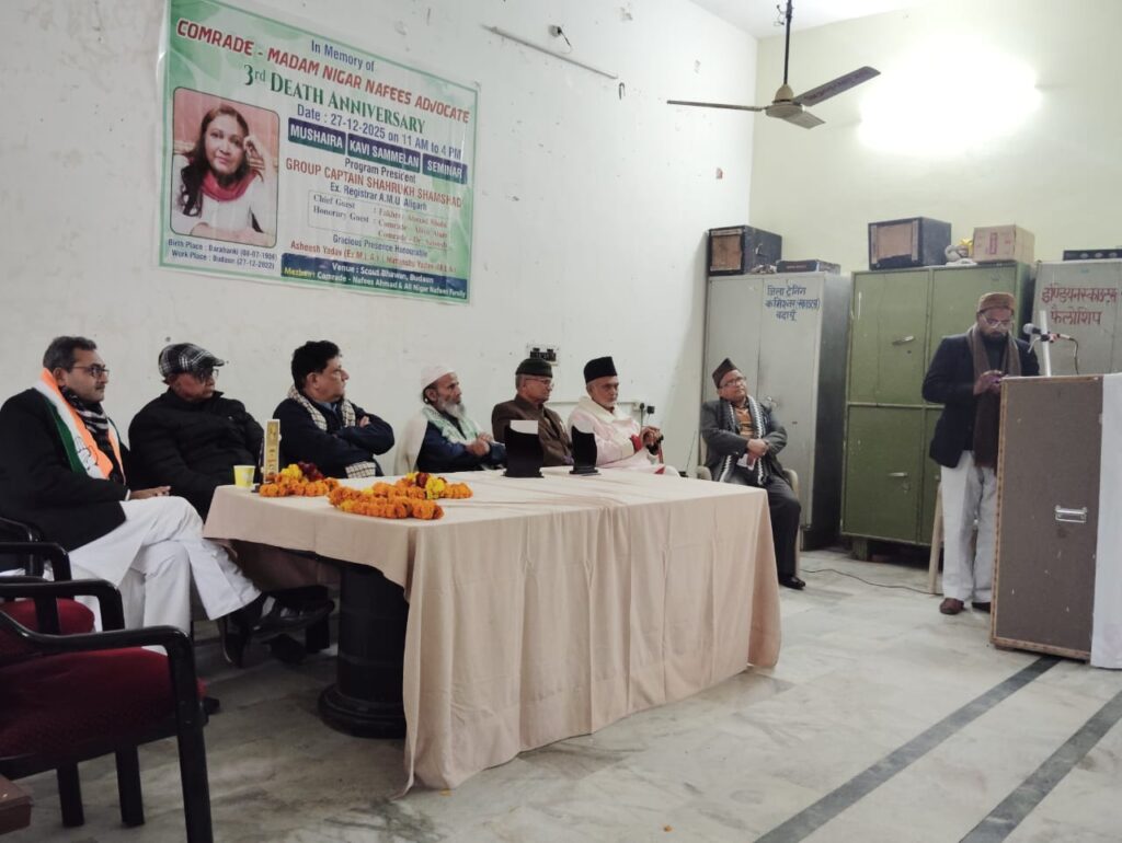 बदायूॅं कम्युनिस्ट नेता कामरेड मैडम निगार नफ़ीस एड, की तीसरी पुण्यतिथि के मौक़े पर विराट कवि सम्मेलन/ मुशायरा एवं सेमिनार का आयोजन स्काउट भवन बदायूॅं में आयोजित किया गया जिस की अध्यक्षता मोहतरम राग़िब ककरालवी साहब व संचालन अहमद अमजदी बदायूॅंनी ने किया कार्यक्रम के मुख्य अतिथि बदायूॅं समाजवादी पार्टी के ज़िला अध्यक्ष पूर्व विधायक श्री आशीष यादव, व वरिष्ठ समाजवादी नेता जनाब फ़ख़रे अहमद शोबी, और बदायूॅं कांग्रेस पार्टी के ज़िला अध्यक्ष श्री अजीत यादव रहे, आयोजक/ संयोजक मोहतरम नफ़ीस अहमद साहब, की इजाज़त से कार्यक्रम का शुभारंभ सरस्वती वंदना राजवीर सिंह तरंग, ब नाते पाक अहमद अमजदी बदायूॅंनी ने पेश की, अध्यक्षता कर रहे राग़िब ककरालवी साहब ने कहा