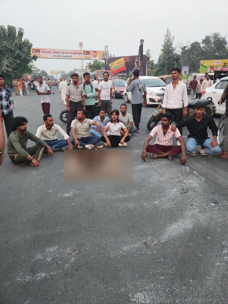 हिंदू संगठन ने चौकी के पास रोड पर गौवंशीय पशु का कटा हुआ सिर रखकर किया प्रदर्शन