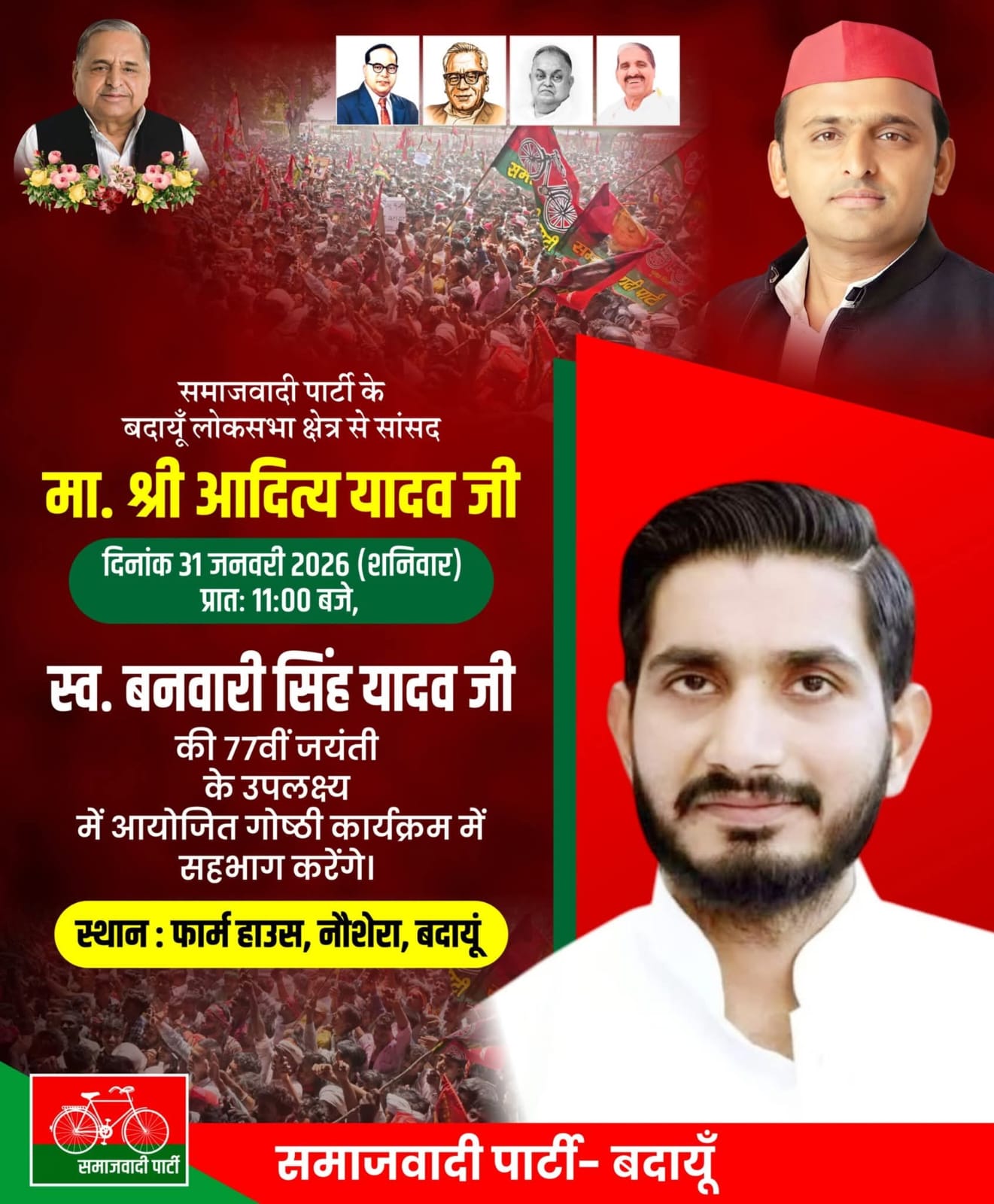 बदायूं। सपा सांसद आदित्य यादव शनिवार को प्रातः 11:00 बजे अपने लोकसभा क्षेत्र के गांव नौशेरा स्थित फार्म हाउस में आयोजित कार्यक्रम में शामिल होंगे। स्वर्गीय पूर्व मंत्री बनवारी सिंह यादव की 77वीं जयंती के उपलक्ष्य में आयोजित कार्यक्रम में शामिल होंगे।