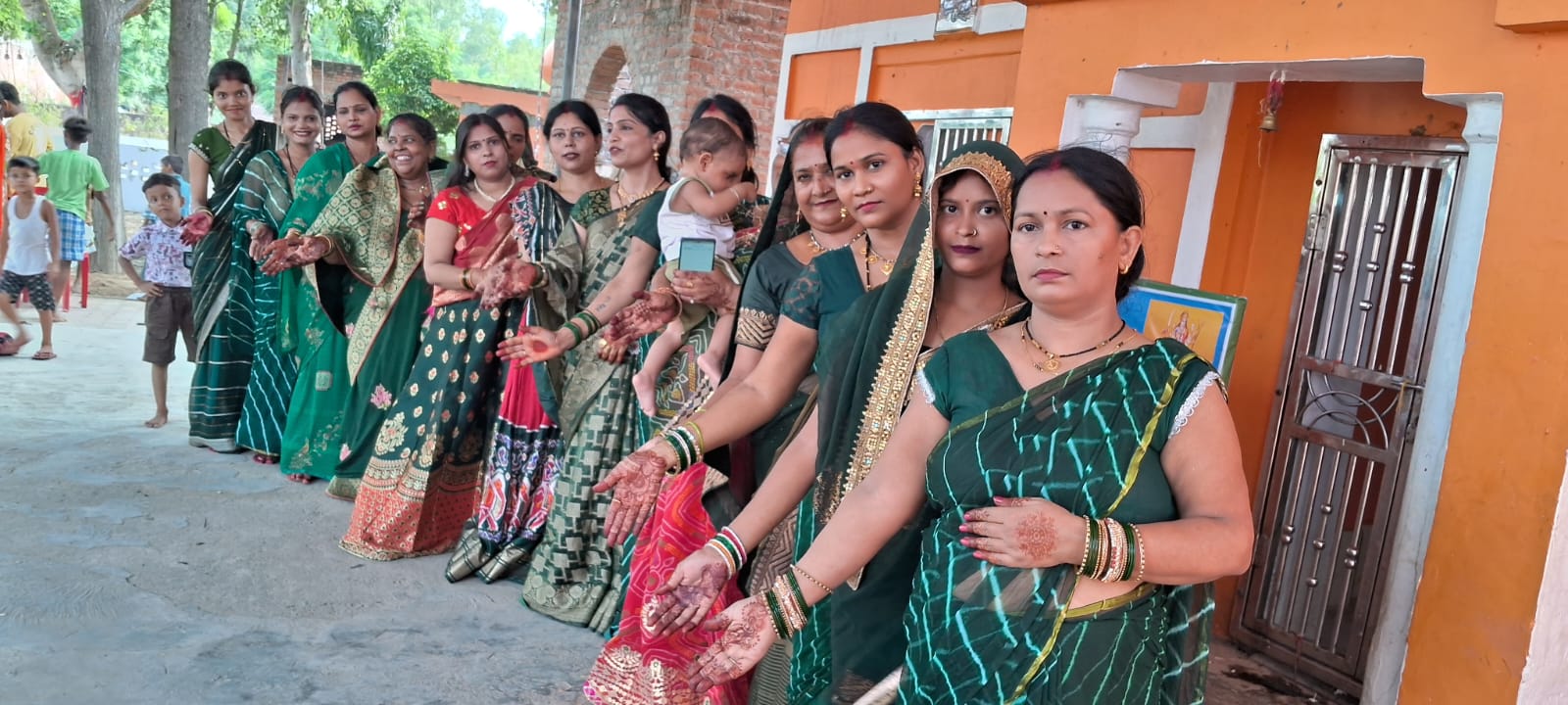 ककराला: नगर स्थित शिव भोले बाबा धाम मंदिर पर हरियाली तीज उत्सव धूम धाम से मनाया गया। सुहागिन महिलाओ ने अपने पति के प्रति प्रेम के लिए मेहंदी लगाईं और हरे कांच की चूड़िया पहनी। सुबह से ही