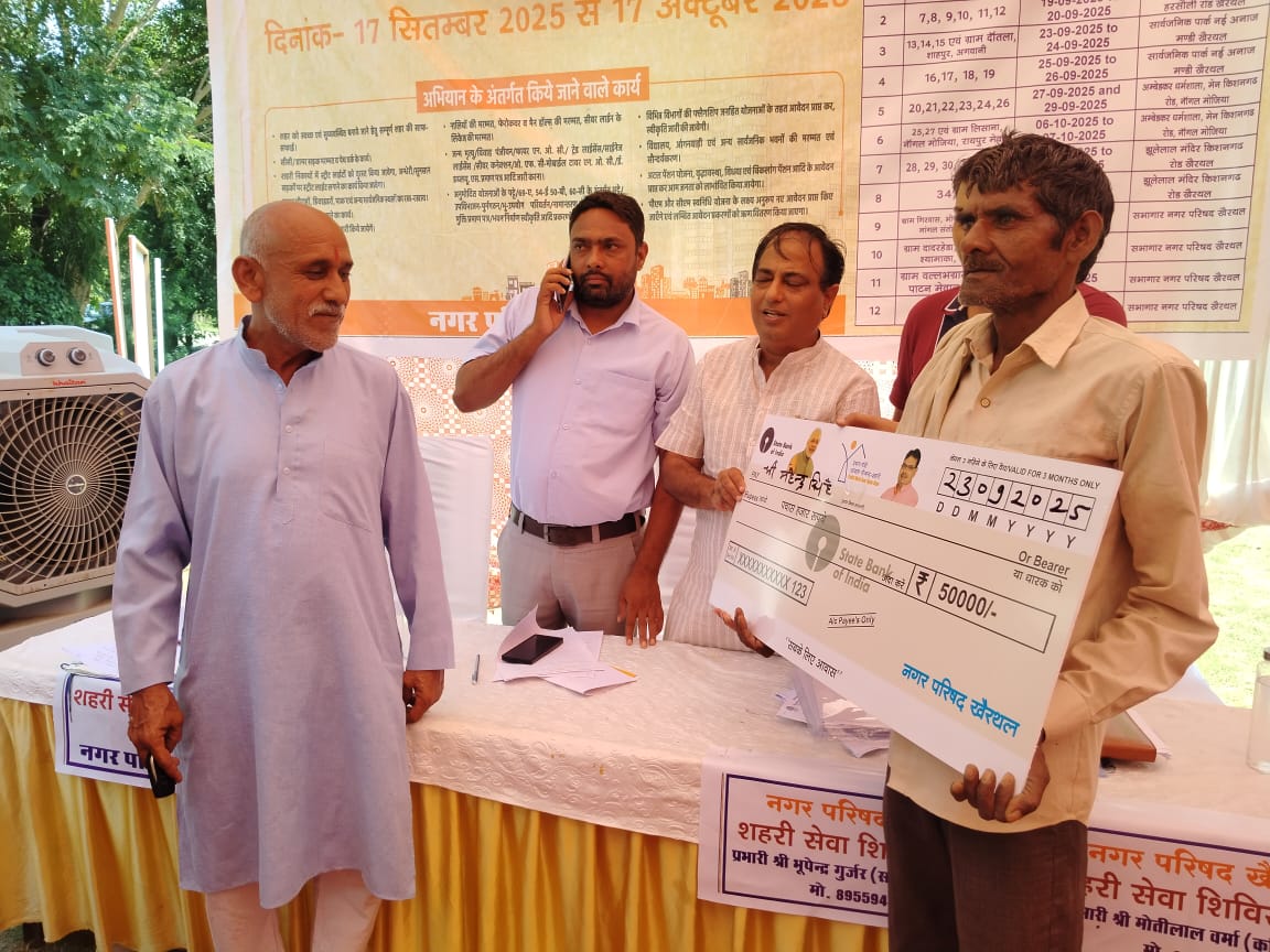 खैरथल-तिजारा, 23 सितम्बर। प्रधानमंत्री आवास योजना 2.0 आमजन के जीवन में नई उम्मीदें जगा रही है। नगर परिषद खैरथल द्वारा 23 सितम्बर को सार्वजनिक पार्क नई अनाज मंडी में आयोजित शहरी सेवा शिविर 2025 में वार्ड नंबर 11, पाटनिया मोहल्ला निवासी महेन्द्र पुत्र बदलूराम को योजना के तहत प्रथम किस्त के रूप में 50,000 रुपये की राशि प्रदान की गई।