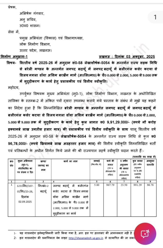 इस सड़क के लिए धनराशि अवमुक्त होने के संबंध में शासन के सचिव अभिषेक गंगवार ने प्रमुख अभियंता लोक निर्माण विभाग को भेजा है l बदायूं विधानसभा क्षेत्र के अंतर्गत आने वाली यह सड़क काफी समय से खस्ताहाल बनी हुई थी बरसात के कारण लोगों को आवागमन में और भी ज्यादा दिक्कत हो रही थी l वजीरगंज क्षेत्र के लोग इस सड़क से होते हुए विजय नगला होकर बरेली को आते जाते हैं बड़ी संख्या में वाहनों का आना-जाना रहता है l सड़क की जर्जर हालत के संबंध में क्षेत्र की जनता ने पूर्व राज्य मंत्री और मौजूदा भाजपा विधायक महेश सिंह गुप्ता को अवगत कराया था श्री गुप्ता ने स्वयं सड़क का जायजा भी लिया था और उन्होंने जनता को इस बात का आश्वासन दिया था कि वह सड़क का पुनर्निर्माण करेंगे इसके लिए पिछले दिनों उन्होंने मुख्यमंत्री से मिले थे l पूर्व राज्य मंत्री ने मुख्यमंत्री को इस समस्या से अवगत कराते हुए सड़क के सुदृढ़ीकरण के लिए धनराशि दिलाए जाने का अनुरोध किया था मुख्यमंत्री ने तत्काल ही शासन को इस सड़क के लिए धनराशि दिलाए जाने के निर्देश दिए l प्रस्ताव के अनुसार शासन ने सड़क के सुधरीकरण को 9 करोड़ 91 लख रुपए से अधिक की धनराशि स्वीकृत की l उसी क्रम में शासन ने सड़क का कार्य शुरू कराया जाने के लिए प्रथम किस्त के रूप में 96 लाख 78 हजार रुपए की धनराशि अवमुक्त की है l