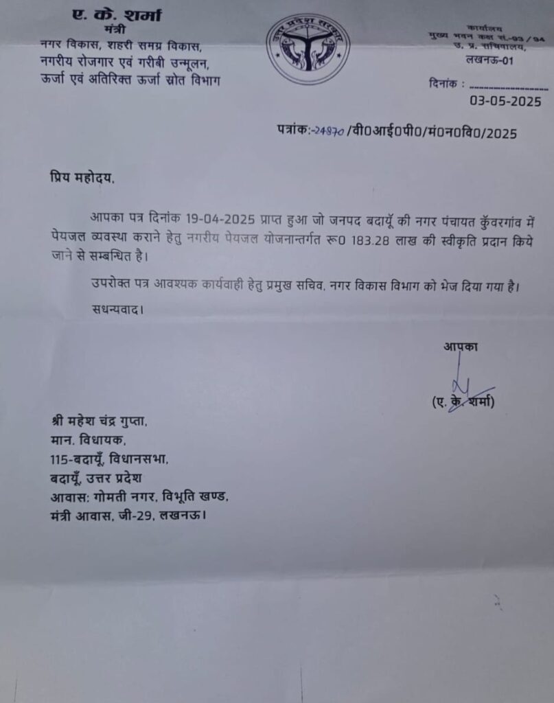 बदायूं l शहर विधानसभा क्षेत्र के अंतर्गत नगर पंचायत उमरगांव कुवरगांव में पेयजल व्यवस्था के लिए शासन ने एक करोड रुपए की स्वीकृति दी है l क्षेत्रीय भाजपा विधायक पूर्व नगर विकास राज्य मंत्री महेश चंद्र गुप्ता ने कस्बे की पेयजल व्यवस्था को बेहतर बनाए जाने के लिए प्रस्ताव नगर विकास मंत्री को दिया था l नगर