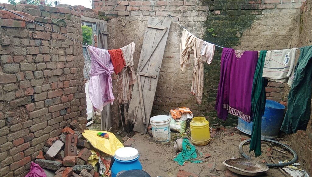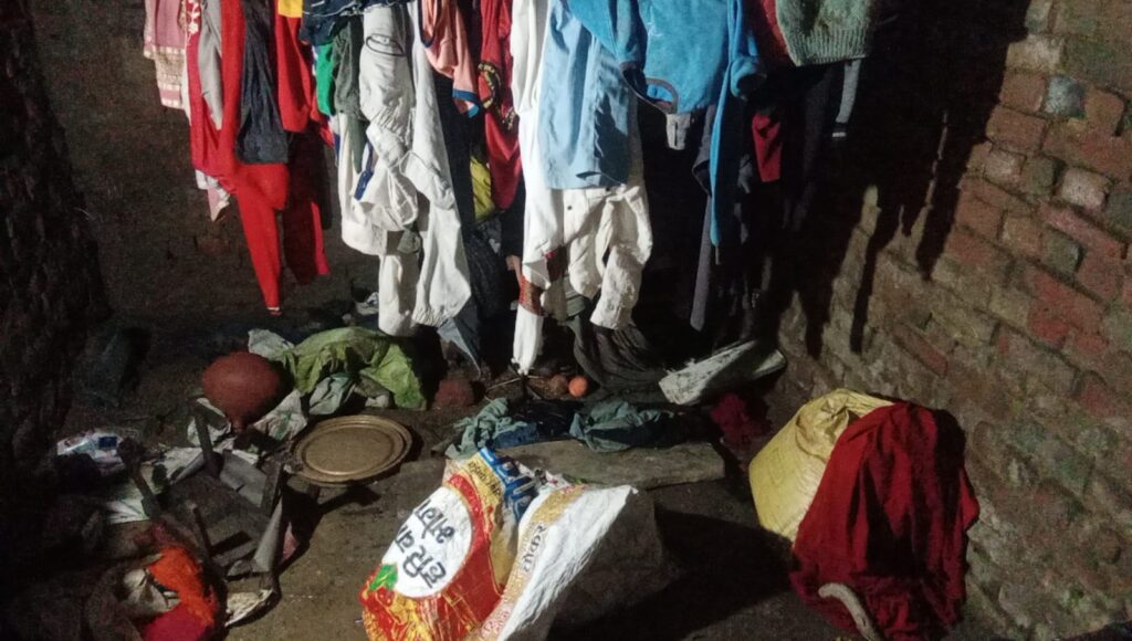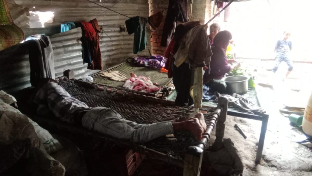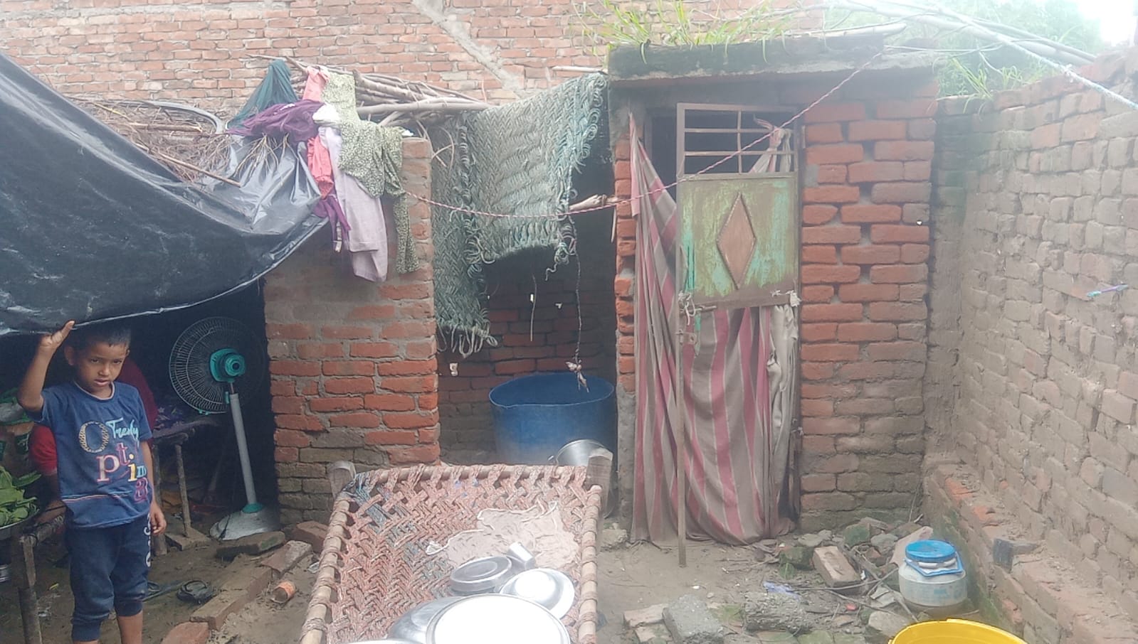 छोटे बच्चों के साथ चारो ओर दीवार की जगह जुगाड़ कर बॉस से टीन लगा कर जैसे तैसे गुज़र बसर कर रही है,छत की जगह मागे तागे की पन्नी डाल सर छुपा रही है